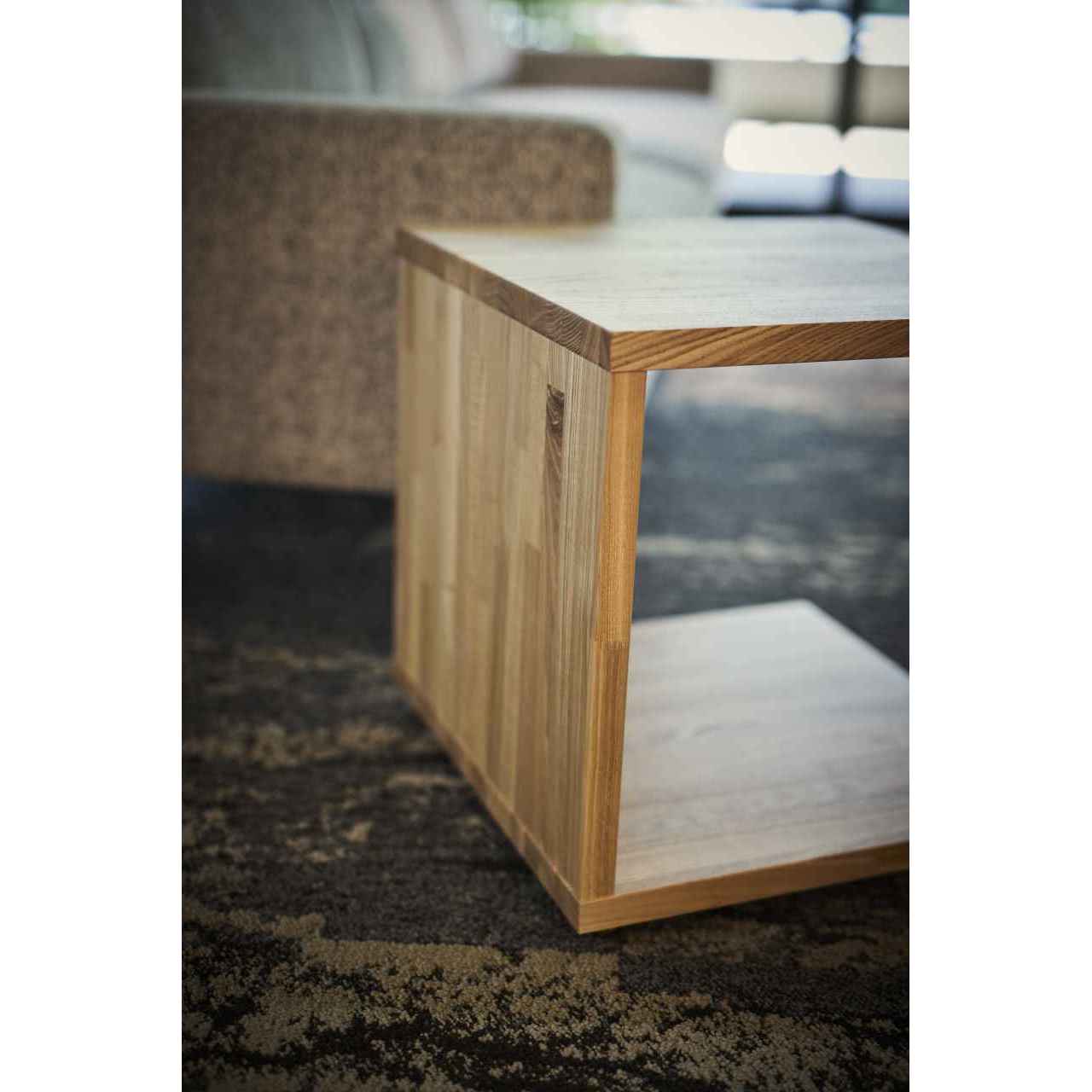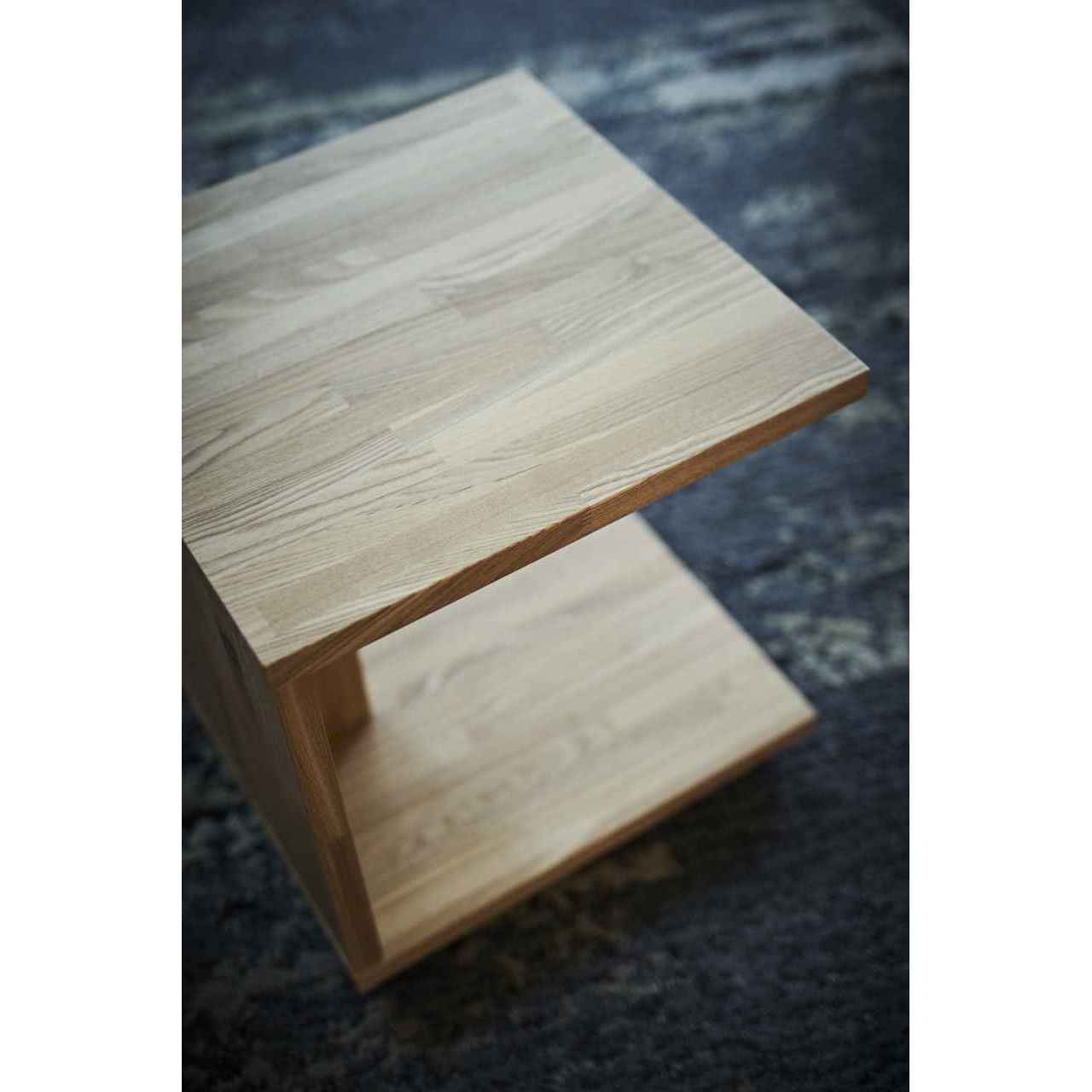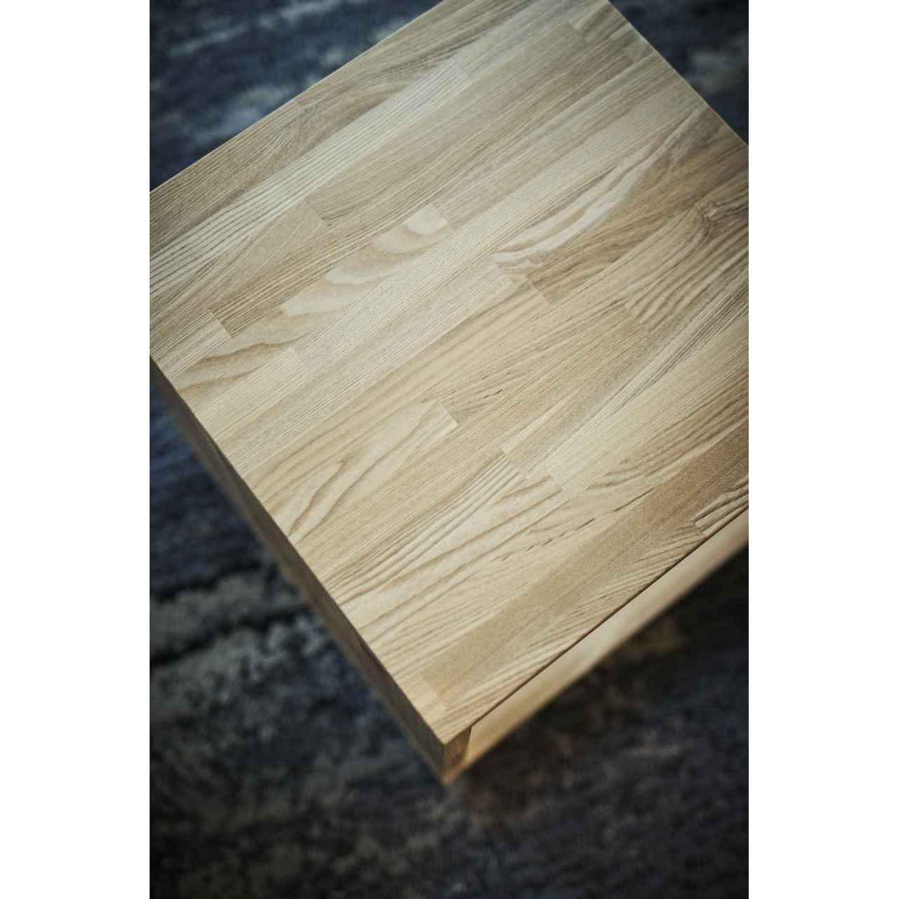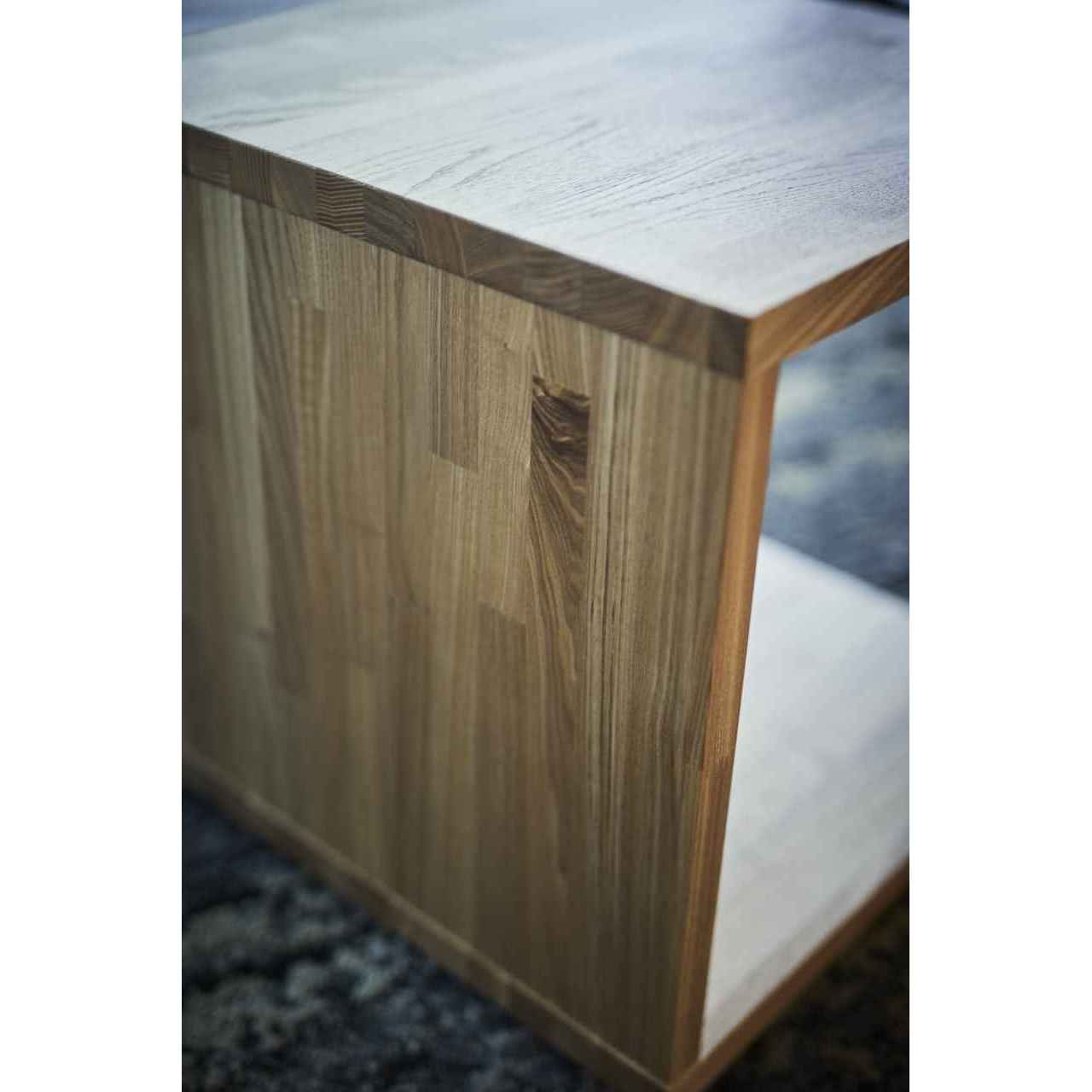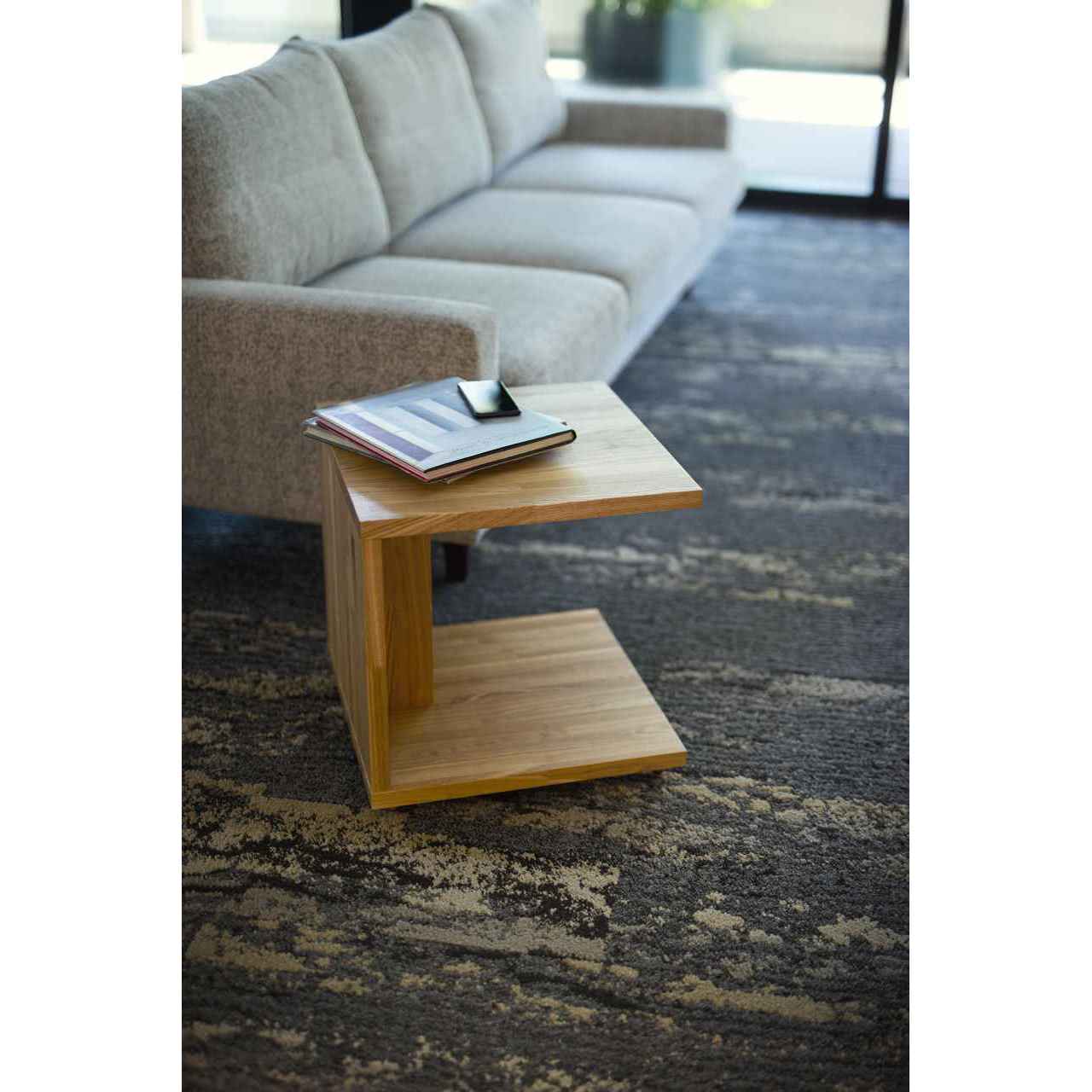 タモ集成材を使用したコの字型のサイドテーブル。底面には小型のボールキャスターが取り付けられており、ソファのサイドテーブルとしてぴったりです。