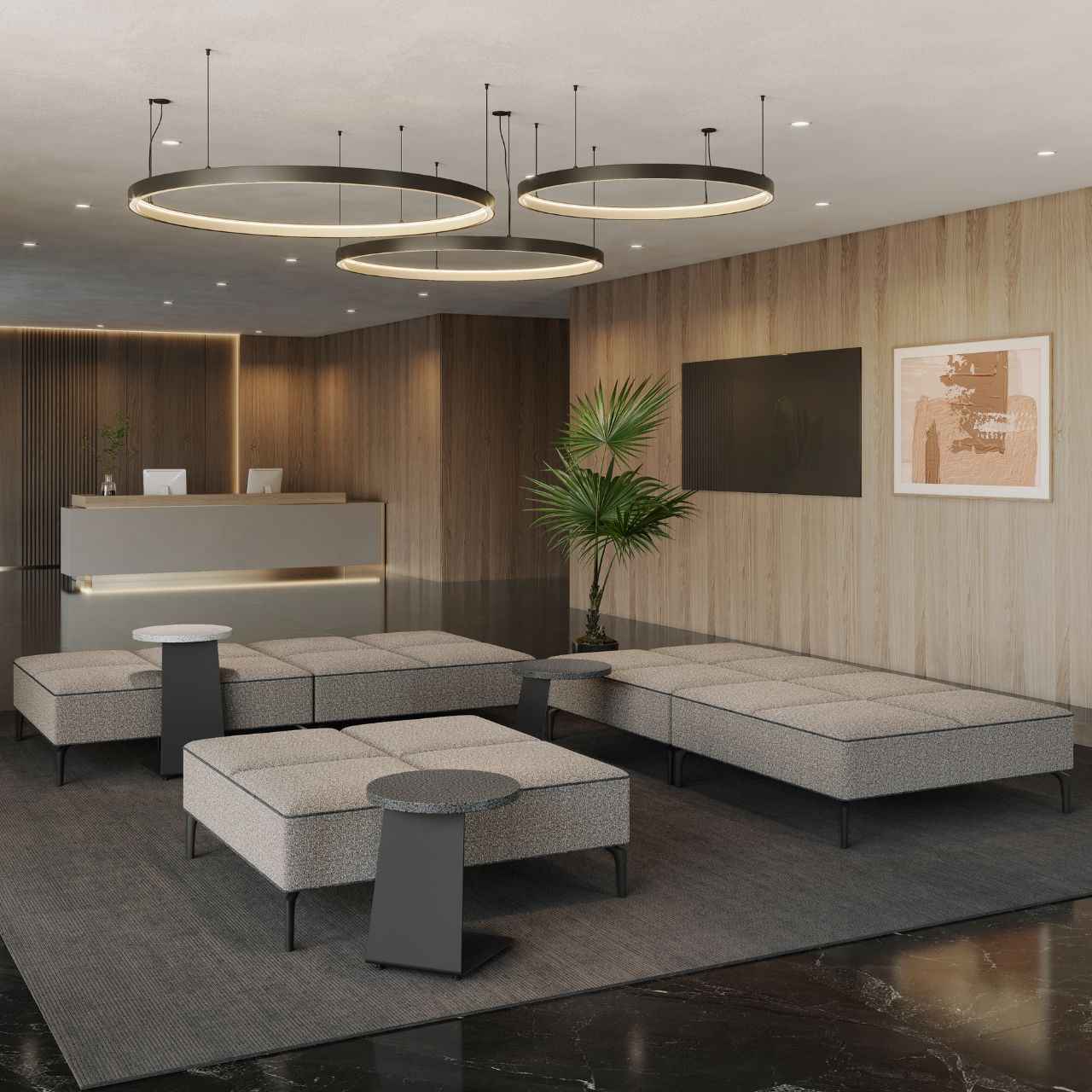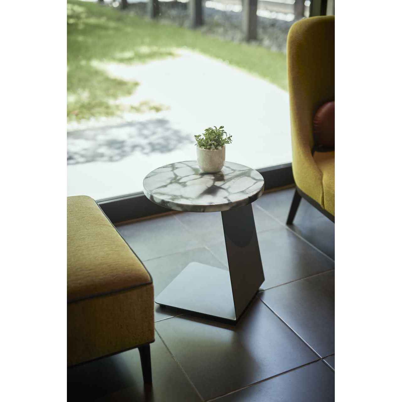 ソファシリーズの使い勝手を高めるために開発した、座面差し込みタイプのサイドテーブルです。ソファに差し込んで使用できるため、省スペースでありながら軽作業に便利なコンパクトサイズ感が魅力です。テーブル高さは500mm・650mmの2種類から選べ、用途に合わせた提案が可能。石目調塗装とメラミン化粧板仕様の2パターンからお選びいただけます。ホテルの待合スペースやオフィスのエントランスエリアなどで活躍します。脚のみの品番(TL010)もご用意しています。