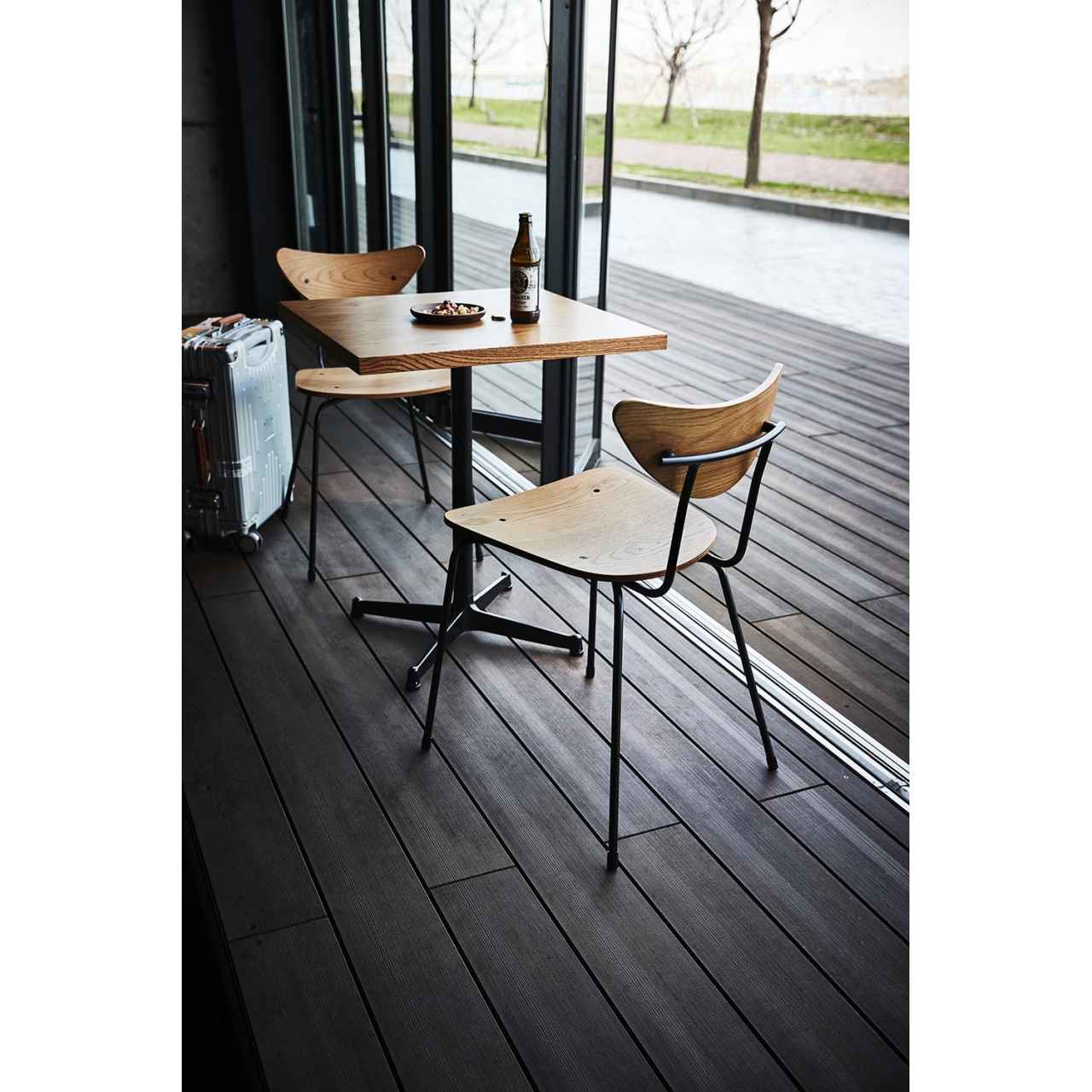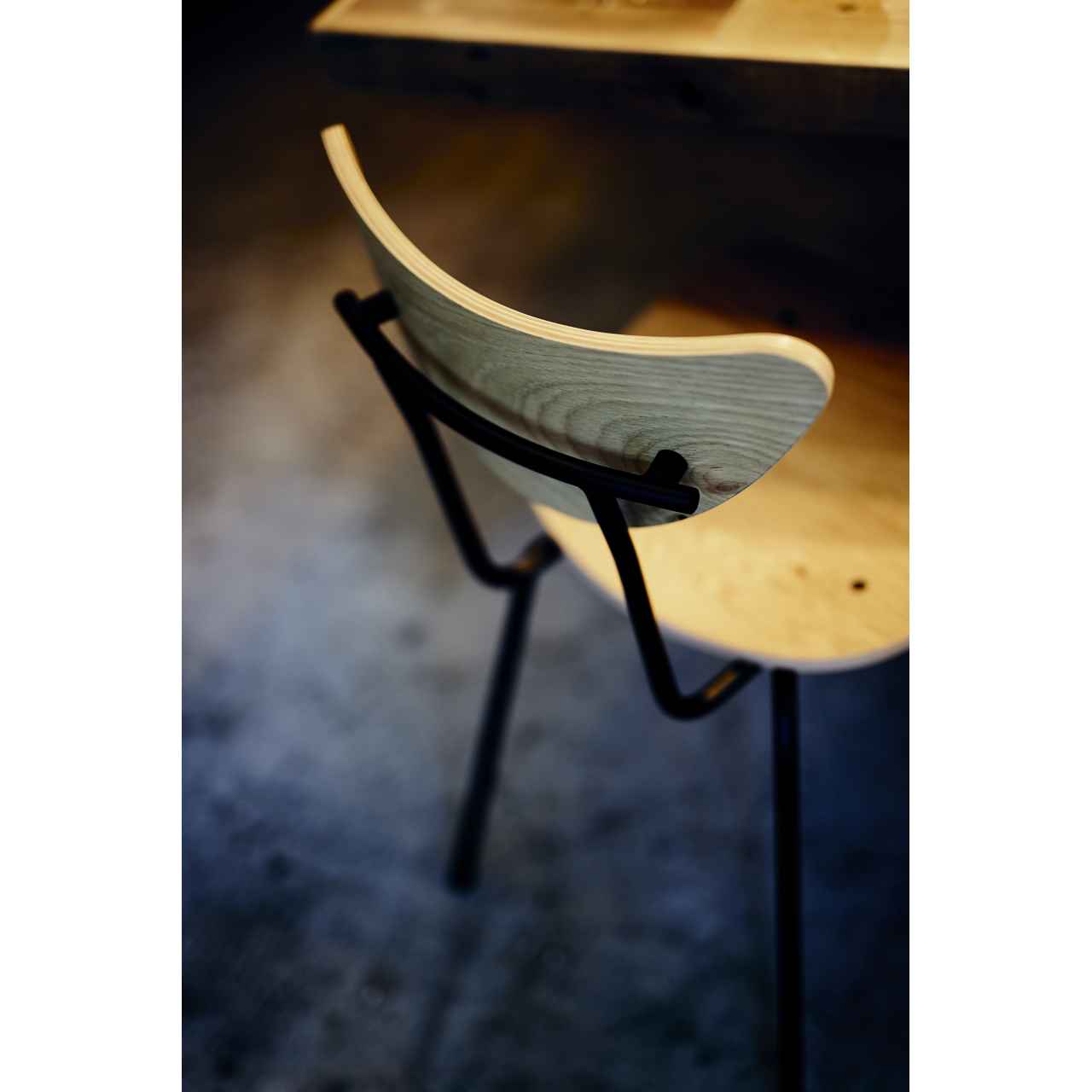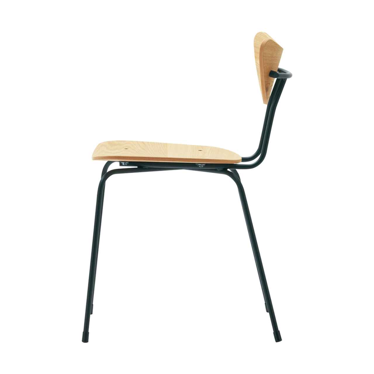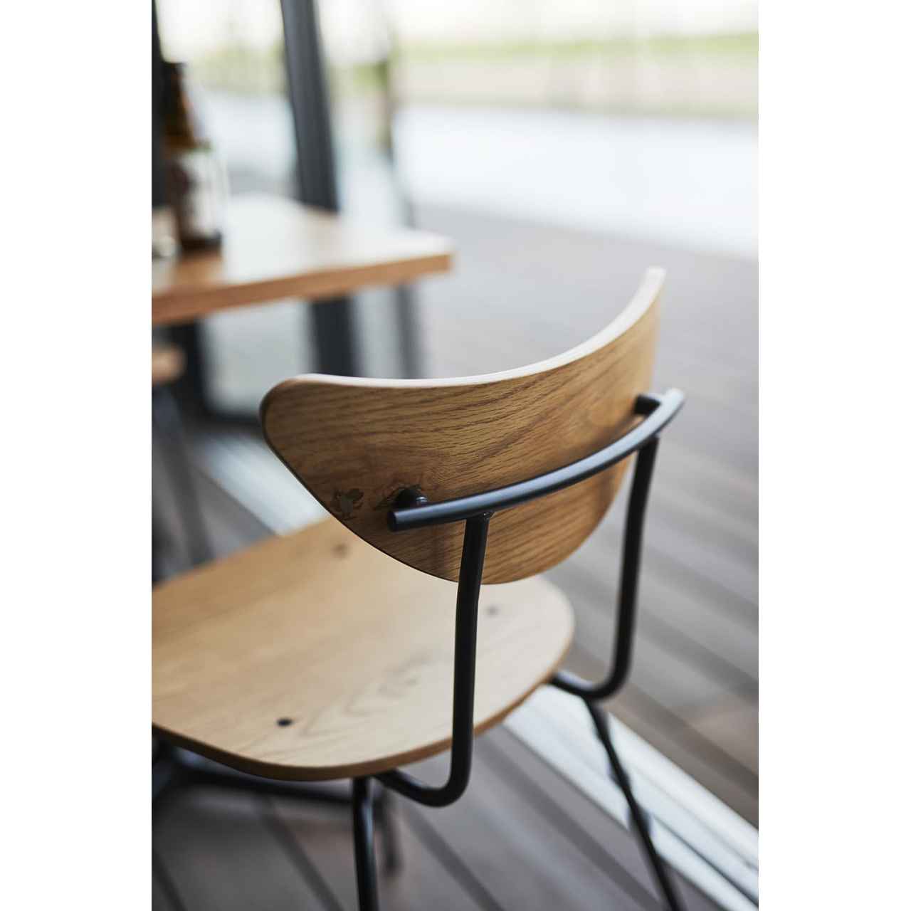 細めのスチールパイプでシャープな印象にしたフレームに、オーク突板プライウッドの背と座を合わせ、スチールチェアでありながらナチュラルな雰囲気を空間に与える事が出来ます。背と座は「張りあり・張りなし」の2タイプからお選びいただけます。
