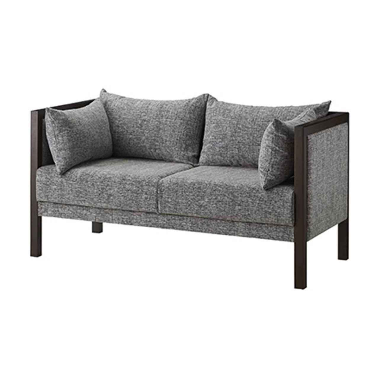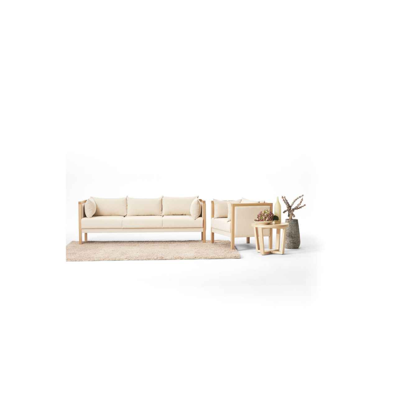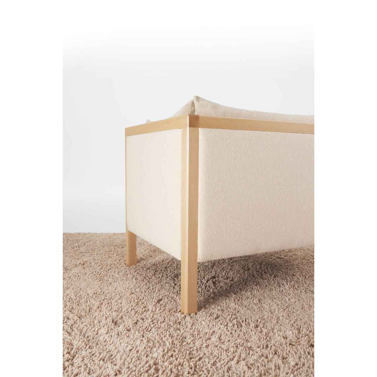 直線的なビーチ材のフレームと、やわらかく身体を包むクッションのコントラストが、静かな存在感を放つソファ。和テイストの空間にも合わせやすいデザインで旅館やラウンジ空間にも調和します。