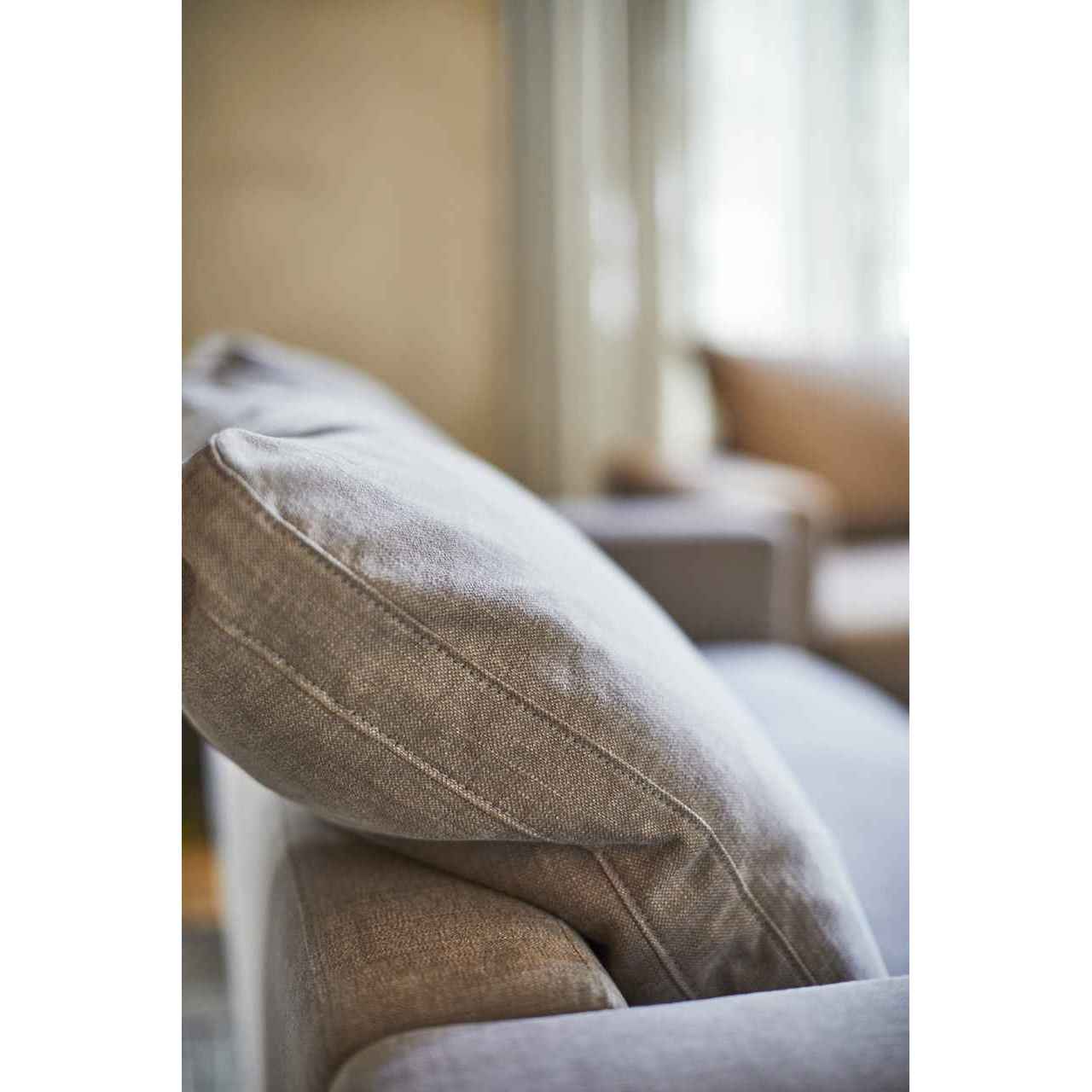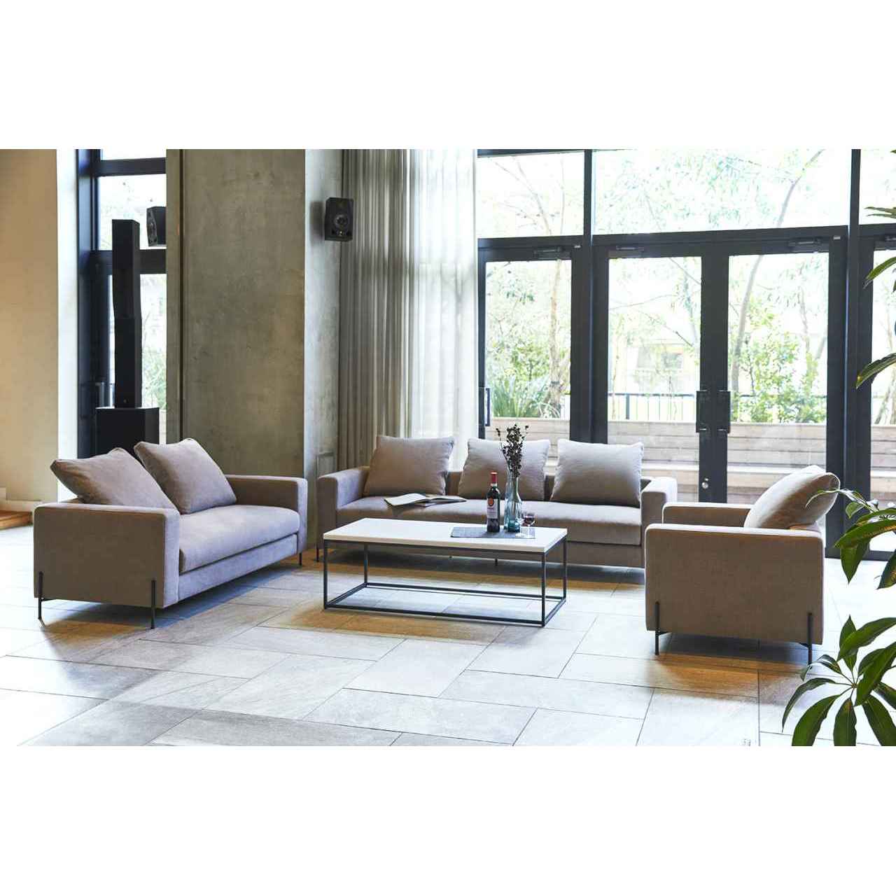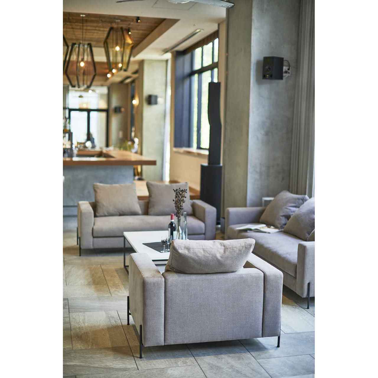 背には対照的にルーズなフェザークッションを組み合わせ、座もふんわりとした仕上がりにする事でクールになり過ぎずゆったりとした時間が流れるロビー空間を演出する。一人掛け「F014-1」、三人掛け「F014-3」を組み合わせてコーディネートしていただけます。