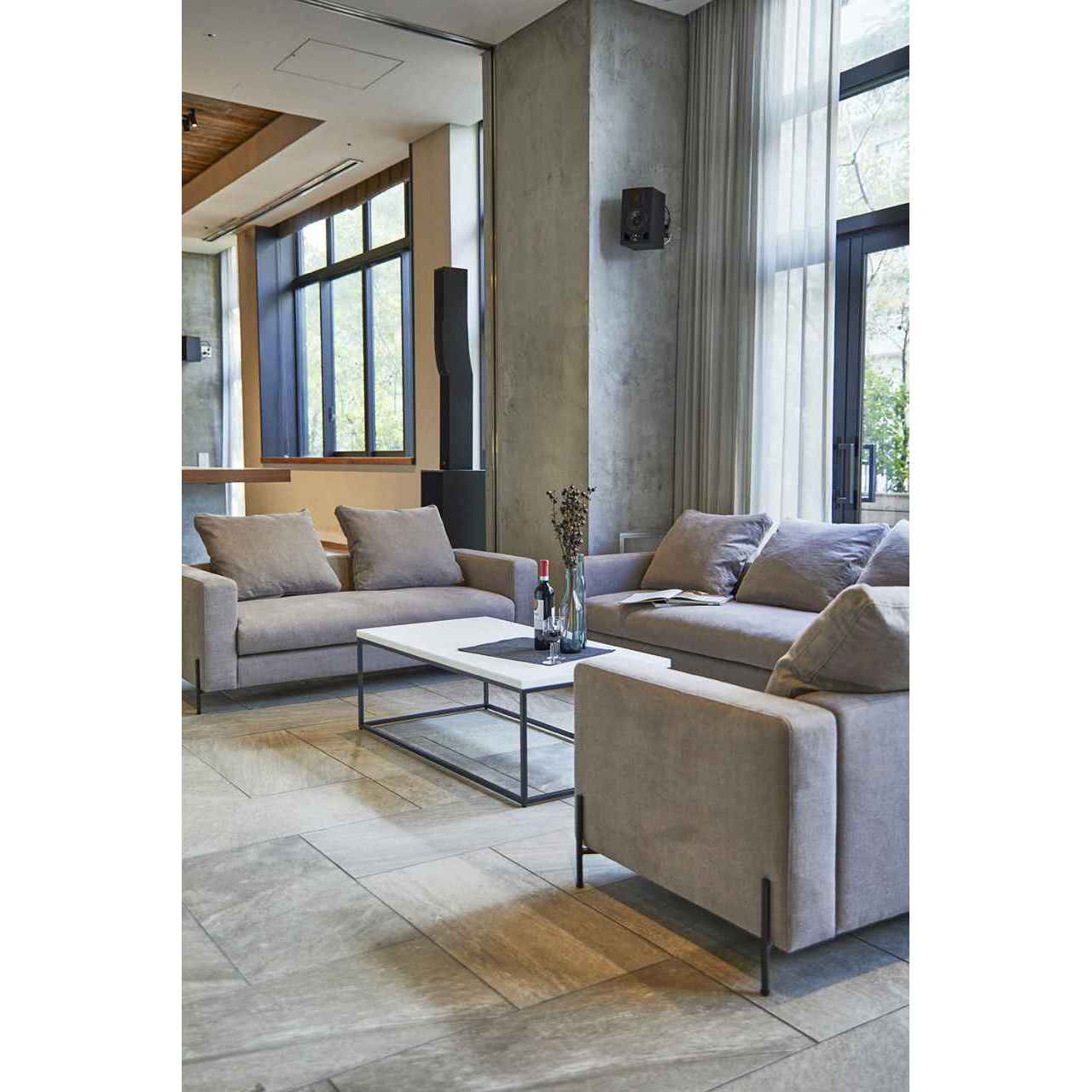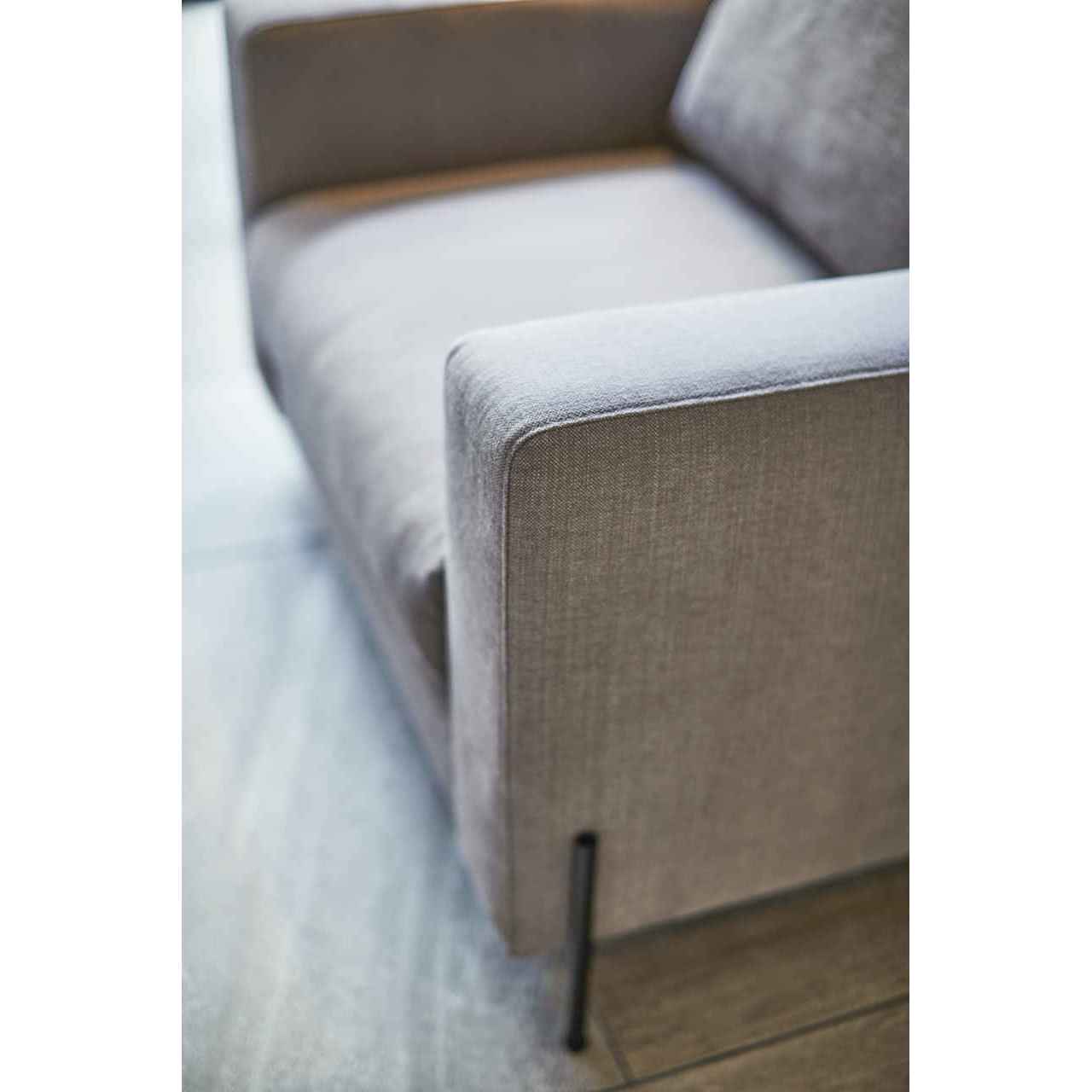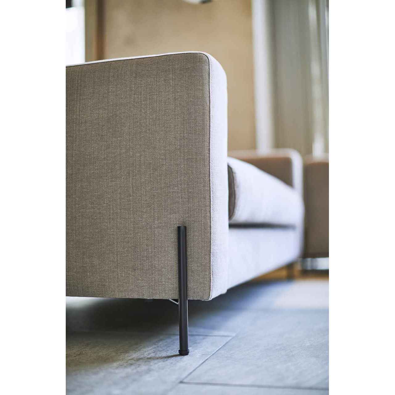 シンプルでスクエアな張部に細いスチールレッグを合わせたシャープなデザインの二人掛けソファ。
