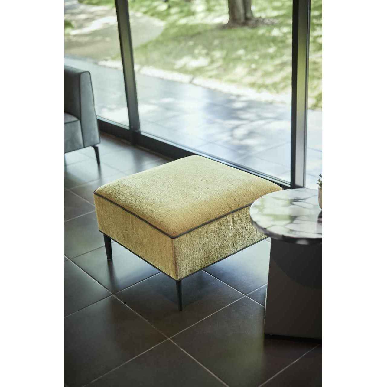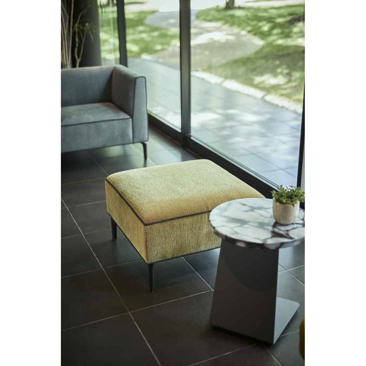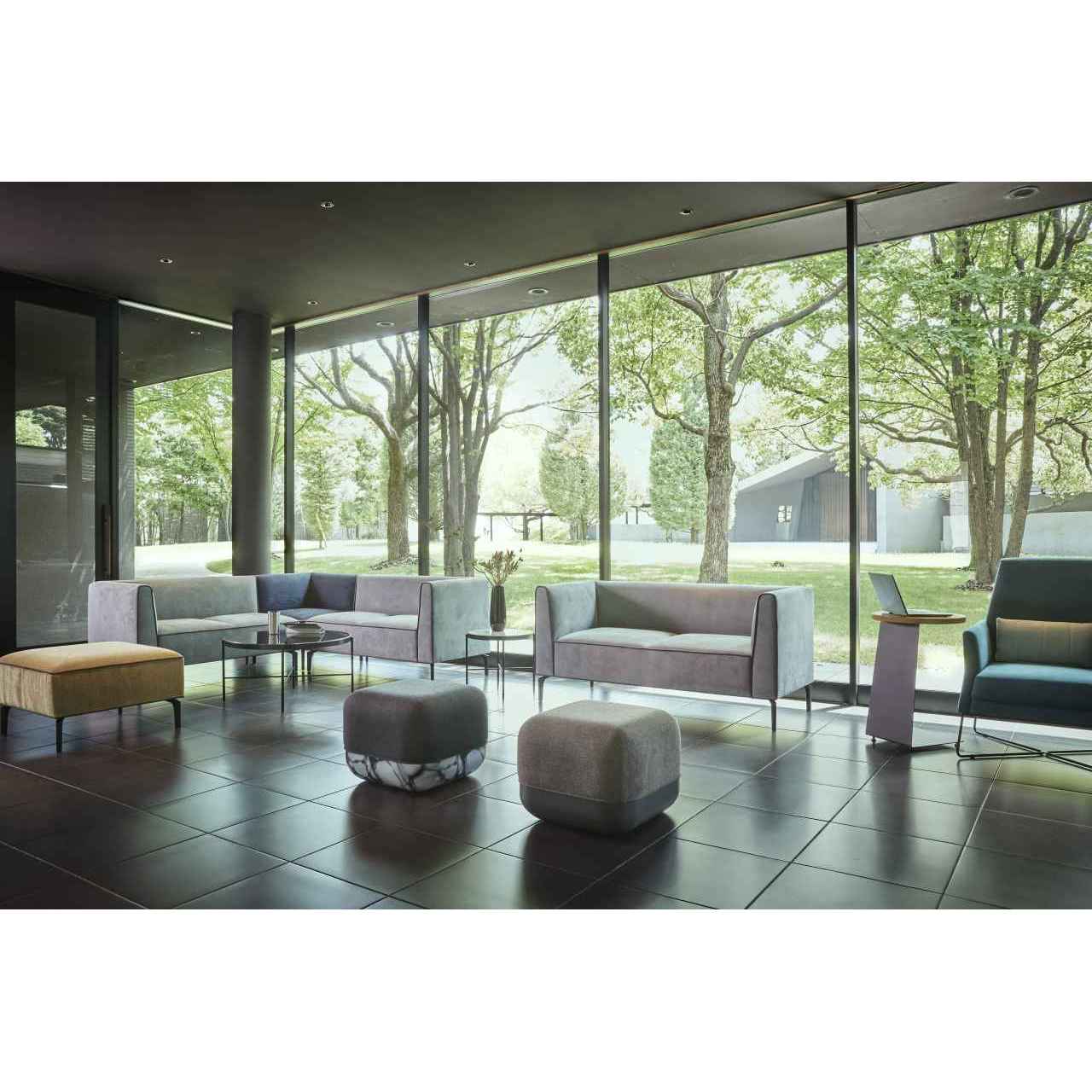 スクエアフォルムにシャープなパイピングラインを効かせたソファシリーズのコンパクトなスツールです。カウチタイプやコーナータイプと組み合わせても美しく収まり、複数台を並べてベンチとして使うことも可能です。張地を変えてアクセントとして配置するなど柔軟なレイアウトに対応します。SH450と少し高めの設定で立ち座りがしやすいサイズ感が魅力です。ホテルや商業施設の共用部などにもご提案いただけます。
