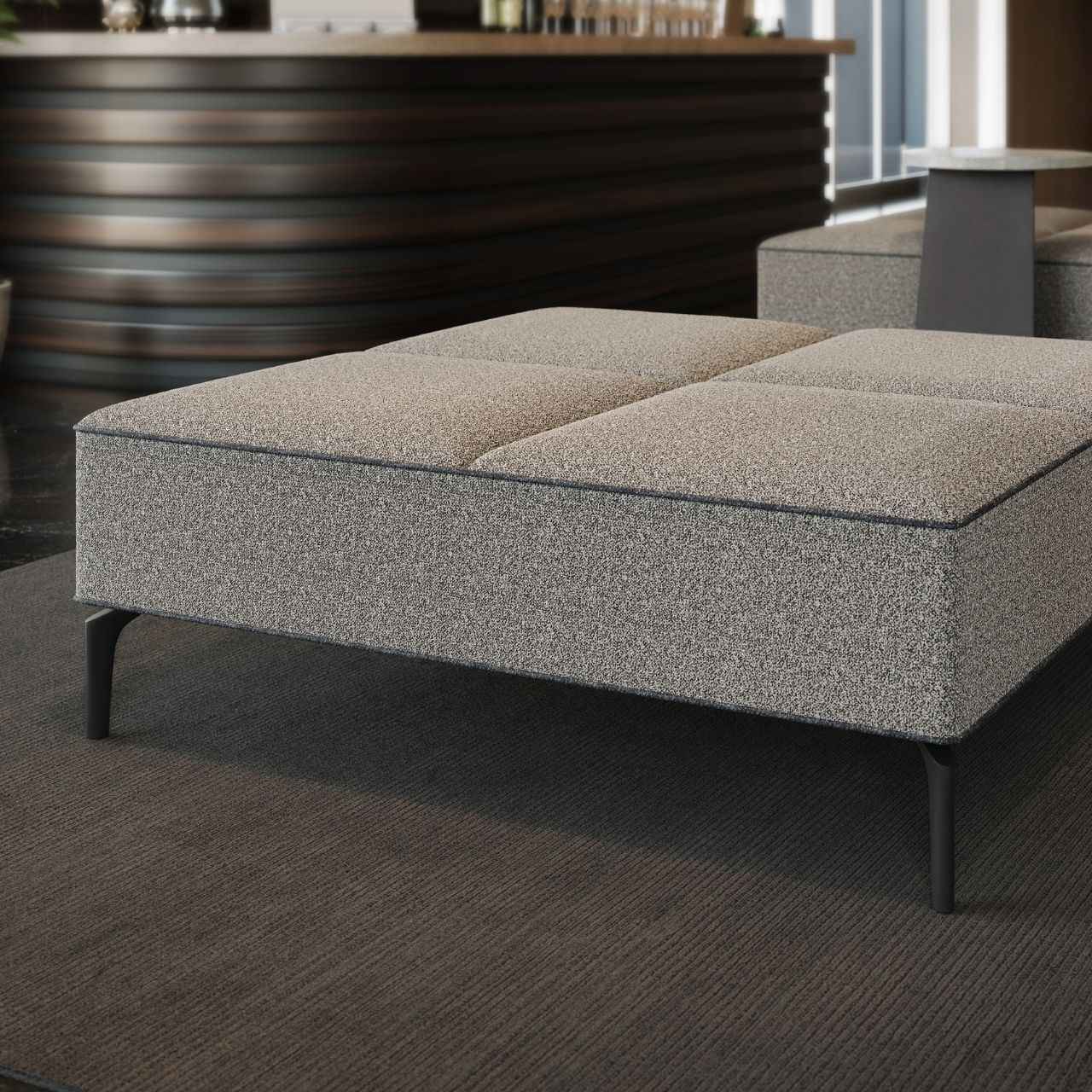 スクエアフォルムにシャープなパイピングラインを効かせたソファシリーズの1200角と大きめのスツールです。座面の引き込みが程よいリズム感を生み、複数人で座れるサイズ感ながらパーソナルスペースも確保しやすい設計です。SH450と少し高めの設定で立ち座りがしやすいサイズ感が魅力です。ホテルや商業施設の共用部などにもご提案いただけます。