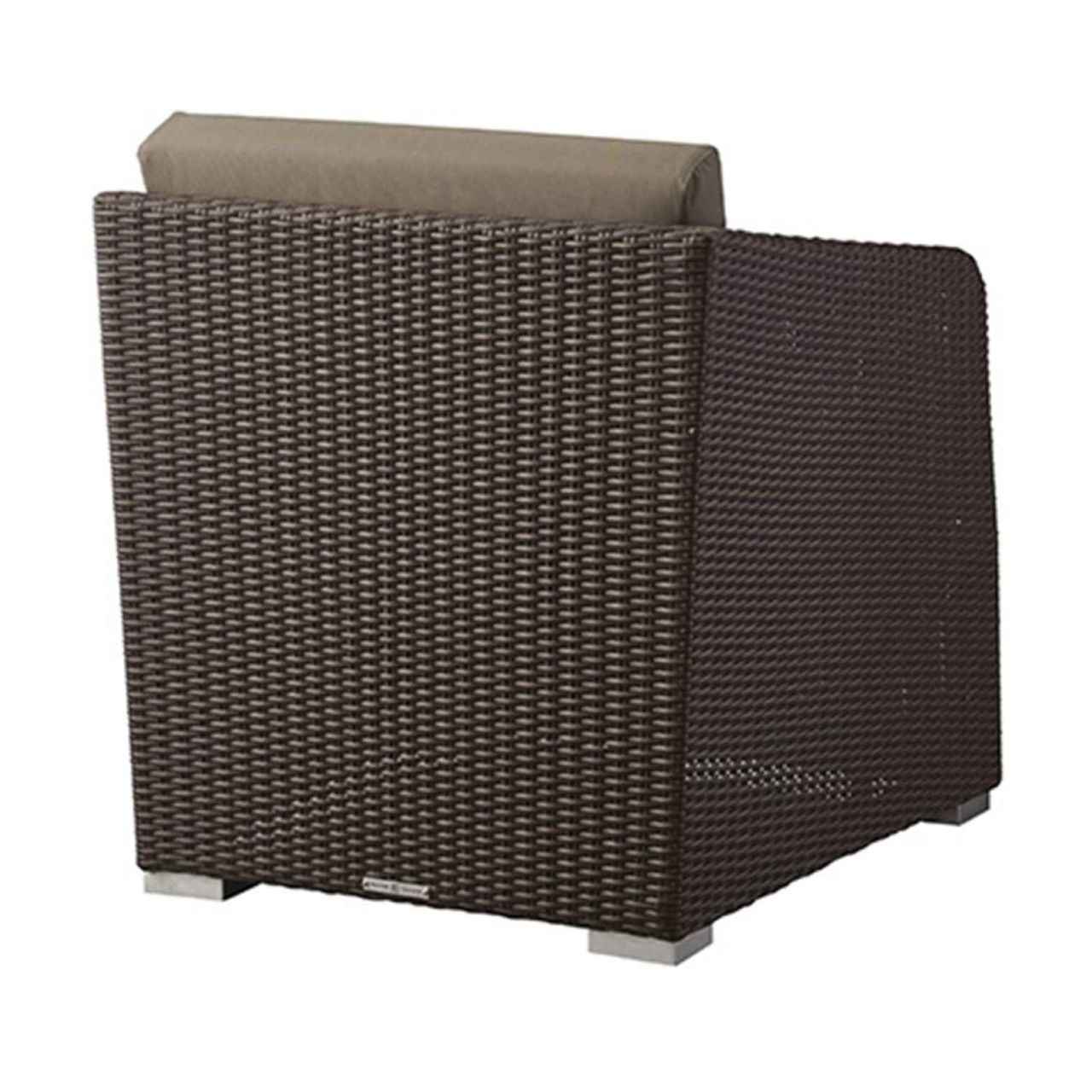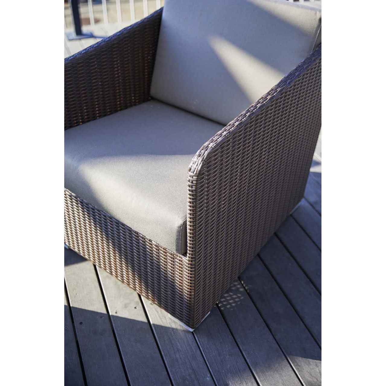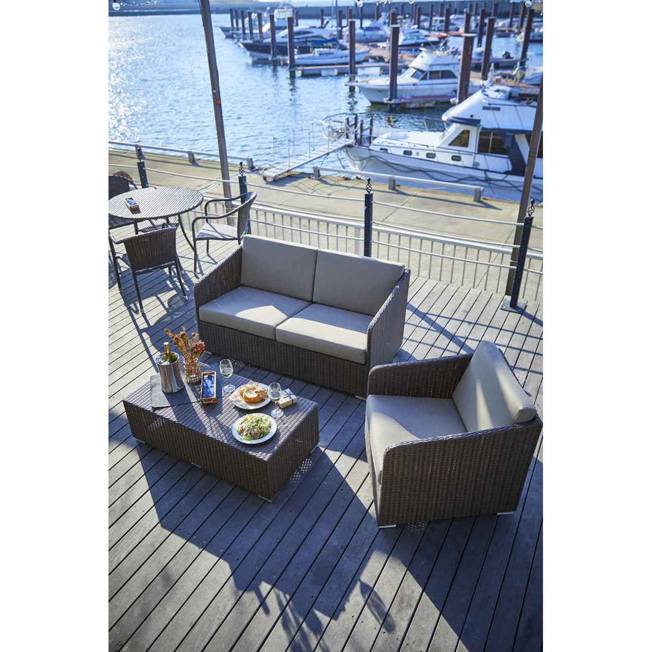 耐候性、褪色性、堅牢性、耐化学薬品性などエクステリアに必要な機能を十分に備える最も優れた人工ラタン素材「RAUCORD」で作られたソファです。優雅で格調高いデザインのソファセット。傾斜した背と座は体を面で受け止め、上質な座り心地、快適性を楽しめます。