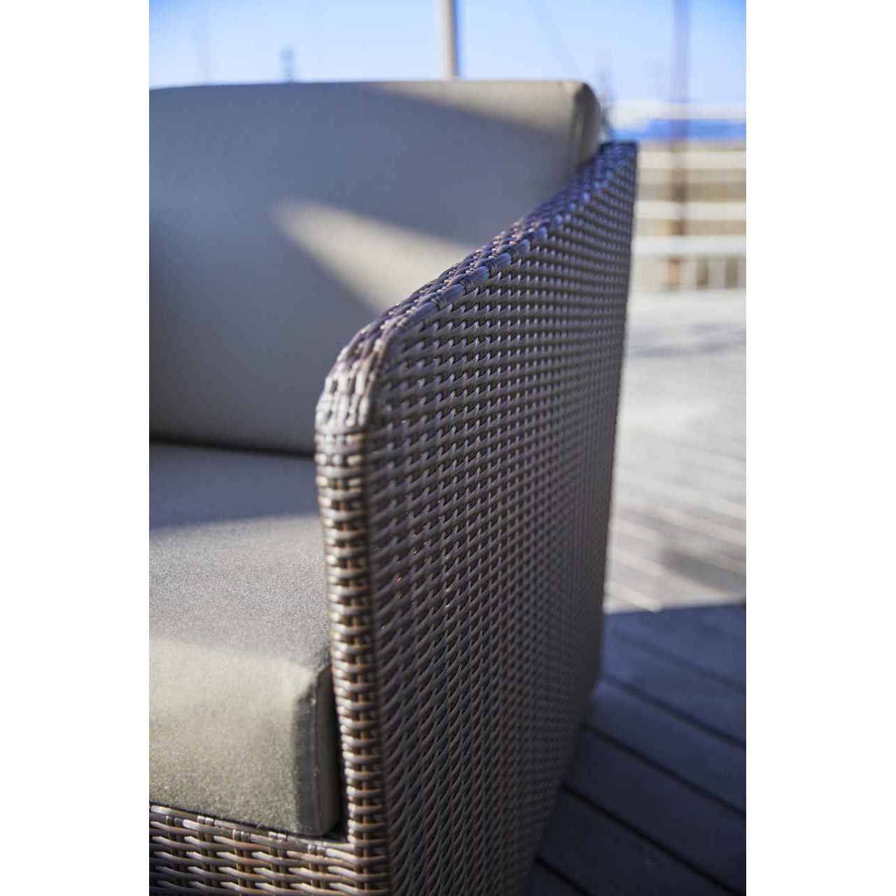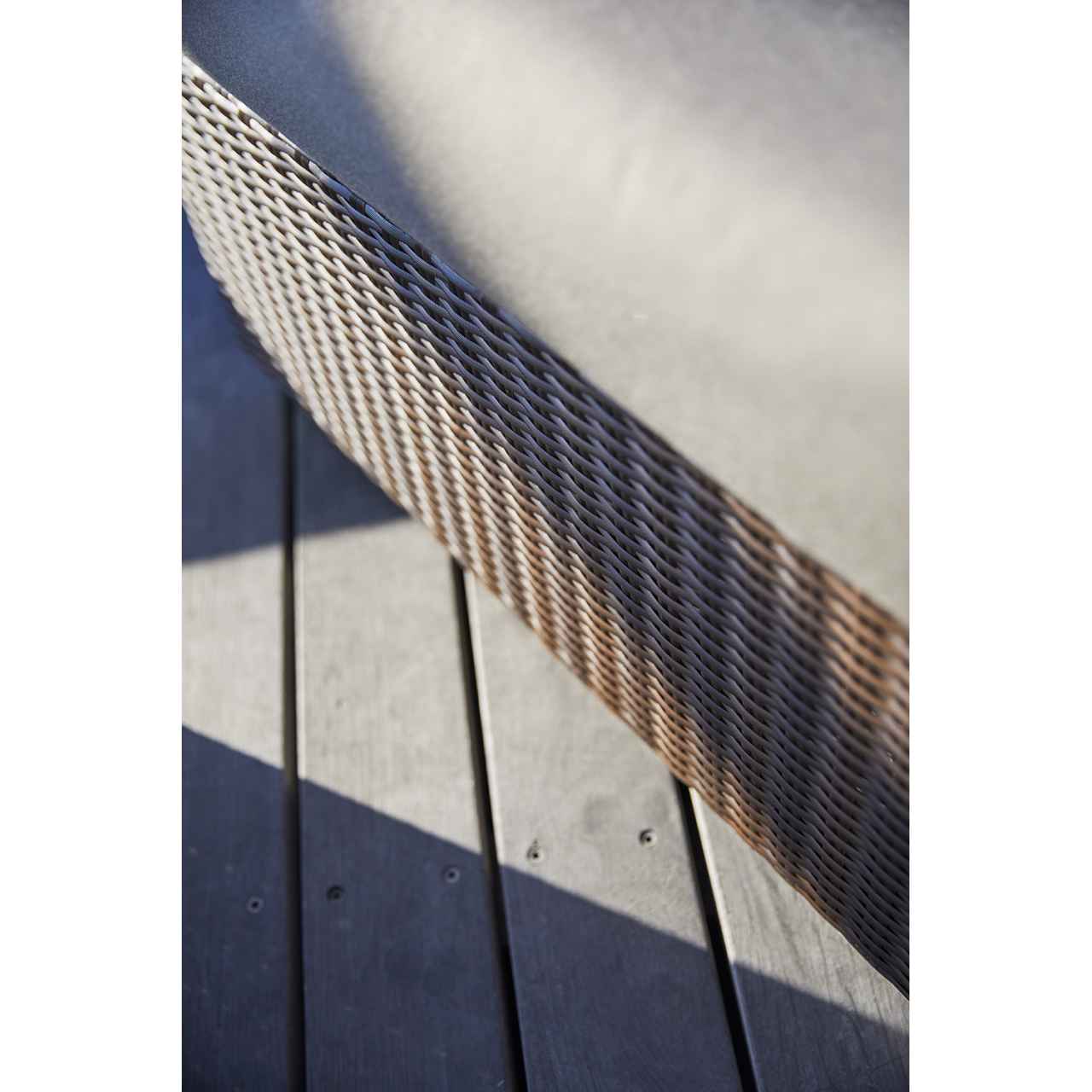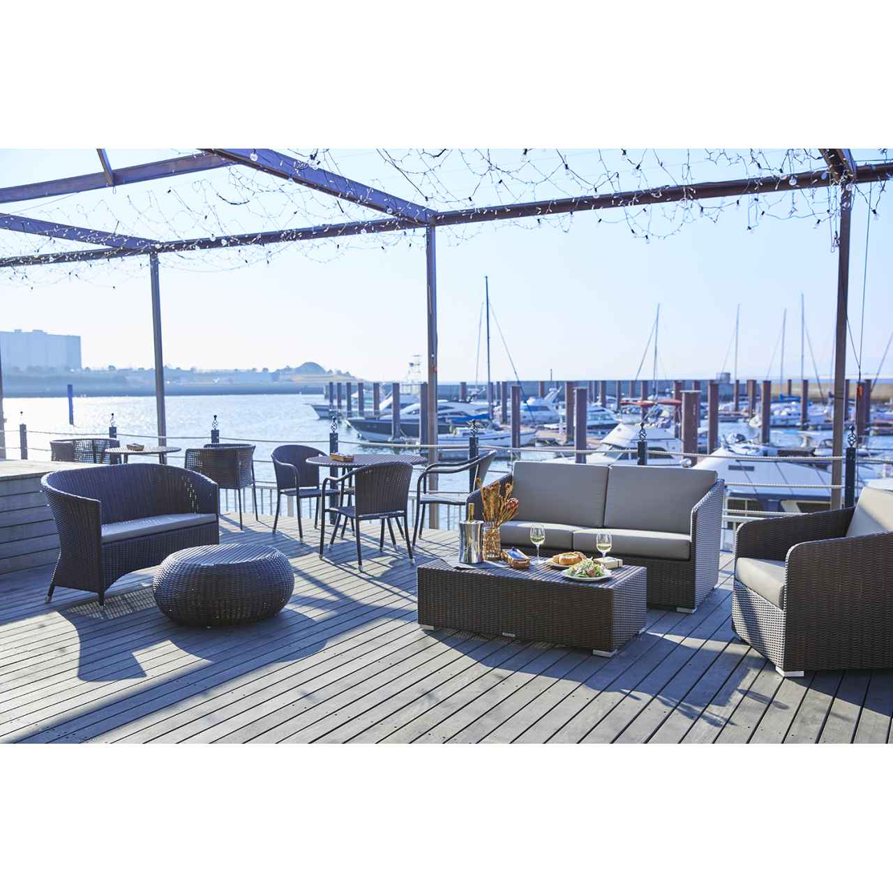 耐候性、褪色性、堅牢性、耐化学薬品性などエクステリアに必要な機能を十分に備える最も優れた人工ラタン素材「RAUCORD」で作られたソファです。優雅で格調高いデザインのソファセット。傾斜した背と座は体を面で受け止め、上質な座り心地、快適性を楽しめます。