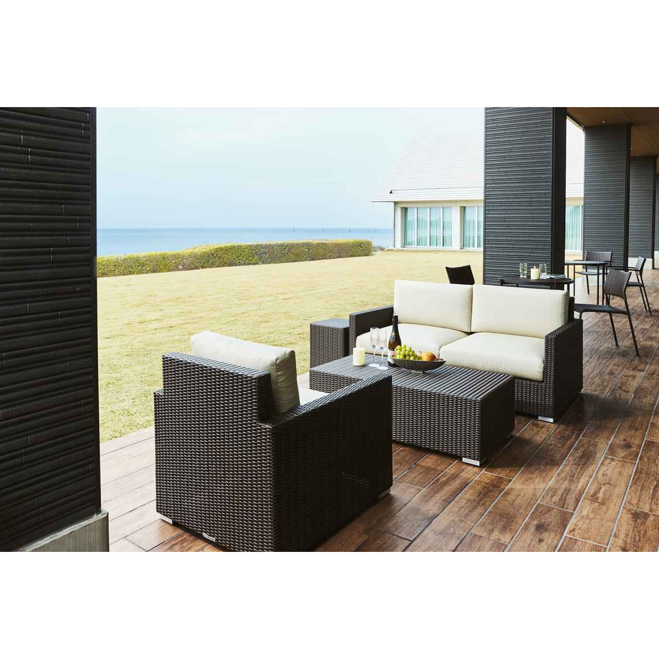 耐候性、褪色性、堅牢性、耐化学薬品性などエクステリアに必要な機能を十分に備える最も優れた人工ラタン素材「RAUCORD」で作られたソファです。スクエアなフォルムが特徴のソファセット。シンプルでありながら、随所に職人の技術の高さを感じることができます。