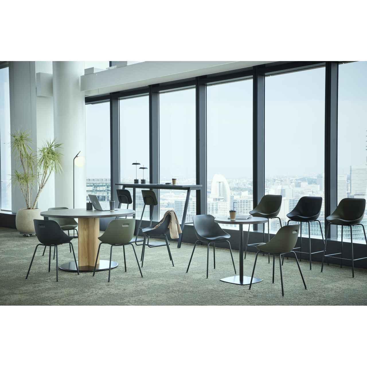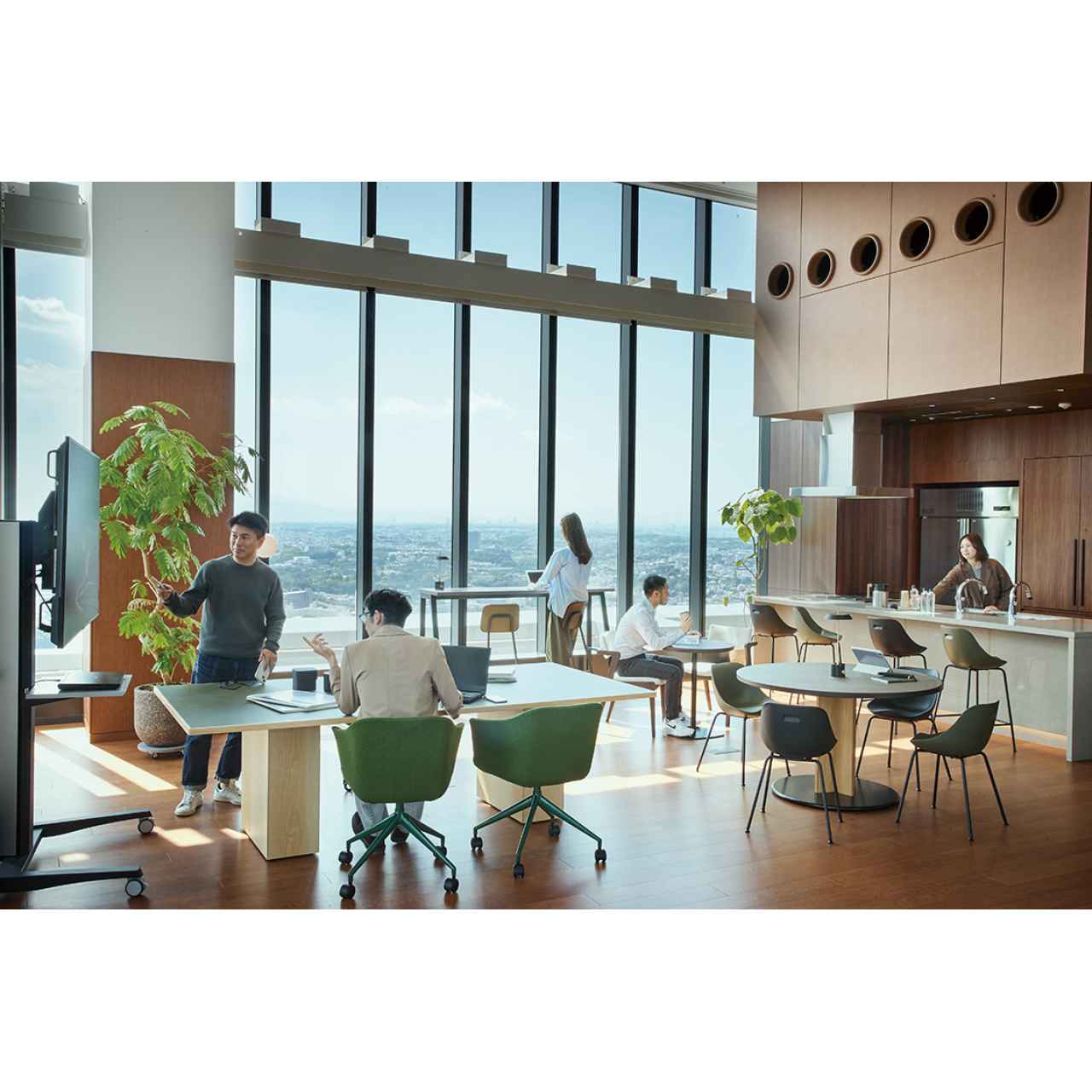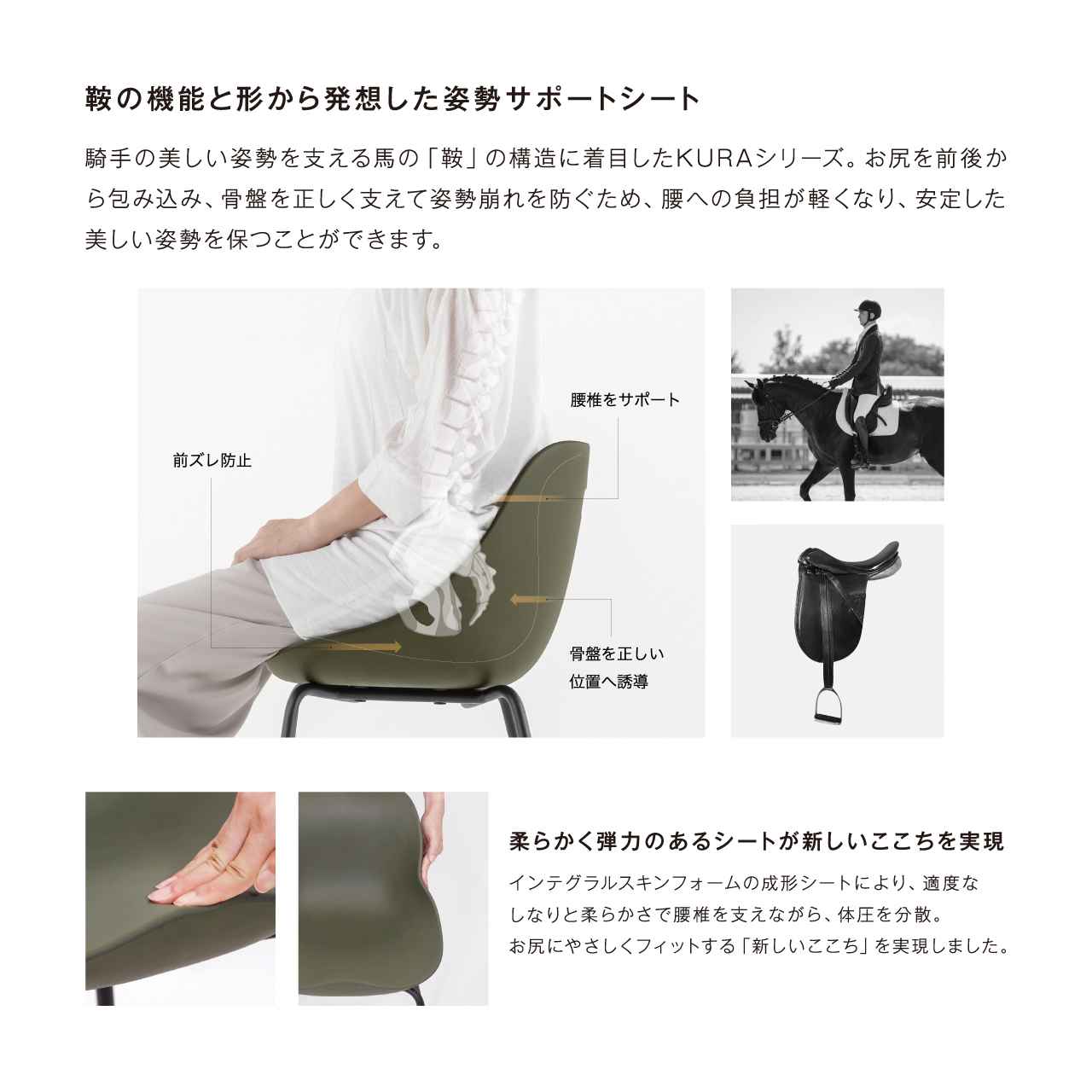 鞍の形状と機能から着想を得た姿勢サポートチェアです。インテグラルスキンフォーム成形シートが適度なしなりと柔らかさでおしりを前後から包み込み、骨盤を正しく支えて姿勢の崩れを防ぎます。腰への負担を軽減し、体圧を均等に分散することで、オフィスのコワーキングエリアやコミュニケーションエリアで安定した美しい姿勢をサポートします。