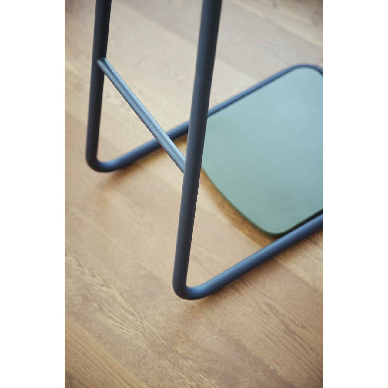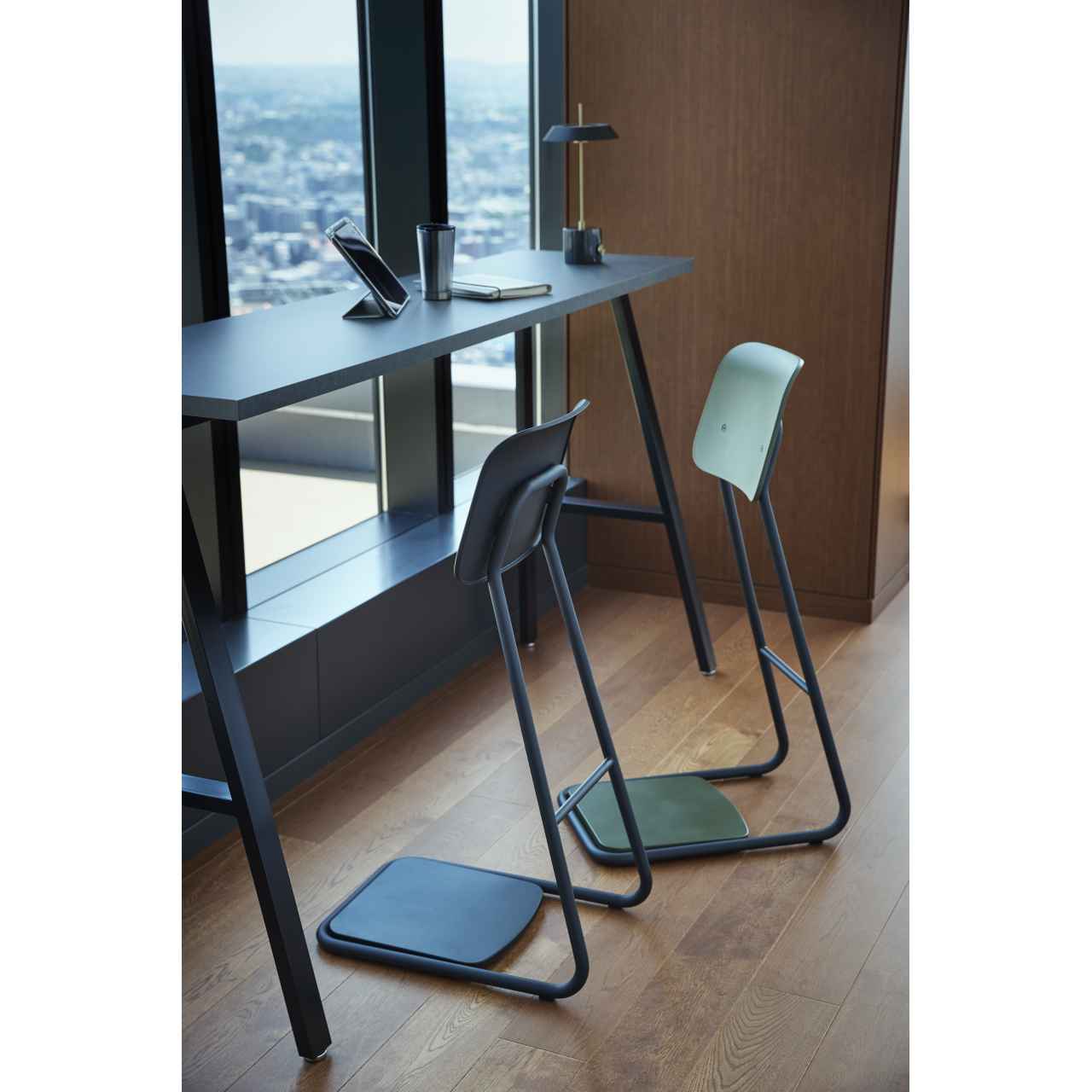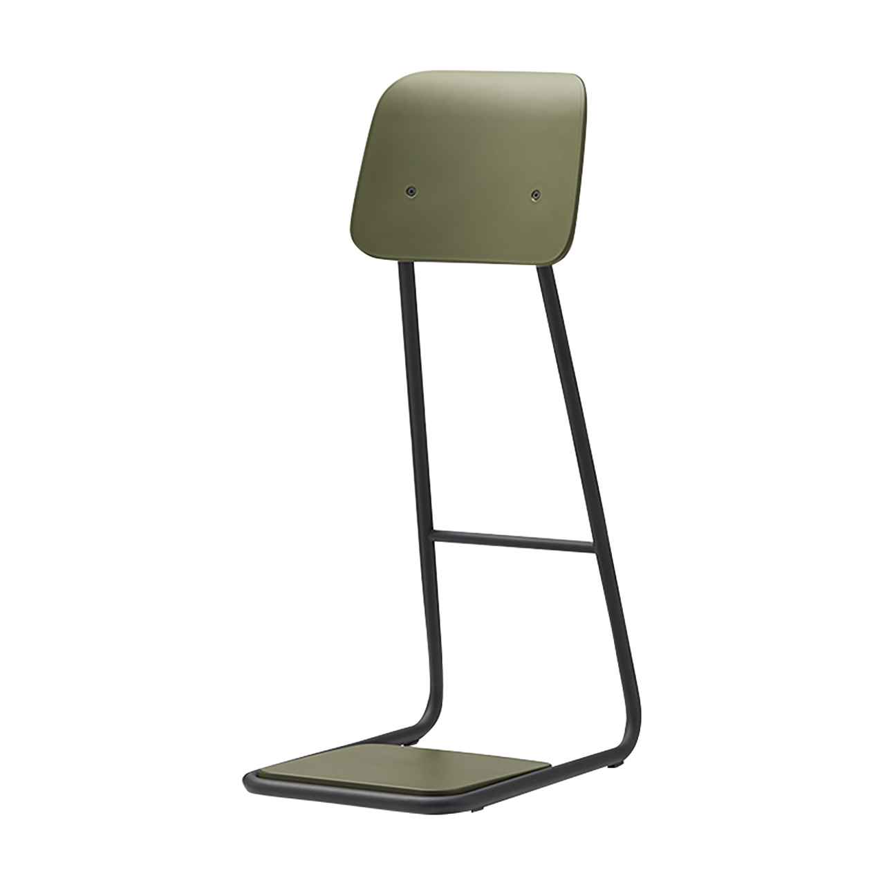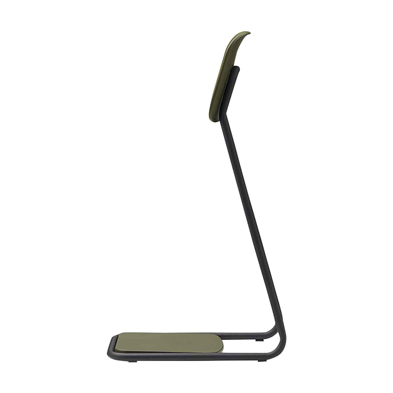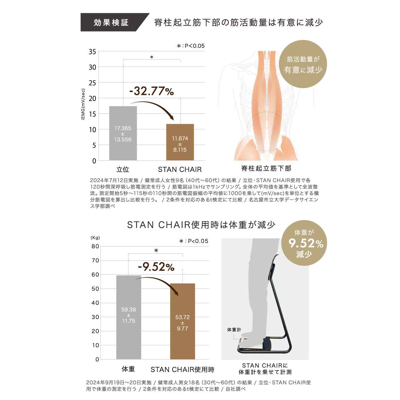 足腰への負担を軽減するスタンディングチェアです。足と腰の2点をサポートすることで、立ち姿勢時の足への負担を分散し、後ろに体を預けながら立つことで背骨が緩やかなS字カーブを描く理想的な立ち姿勢をサポートします。レジカウンターやワークスペース、公共空間などでの立ち作業に最適な一台です。