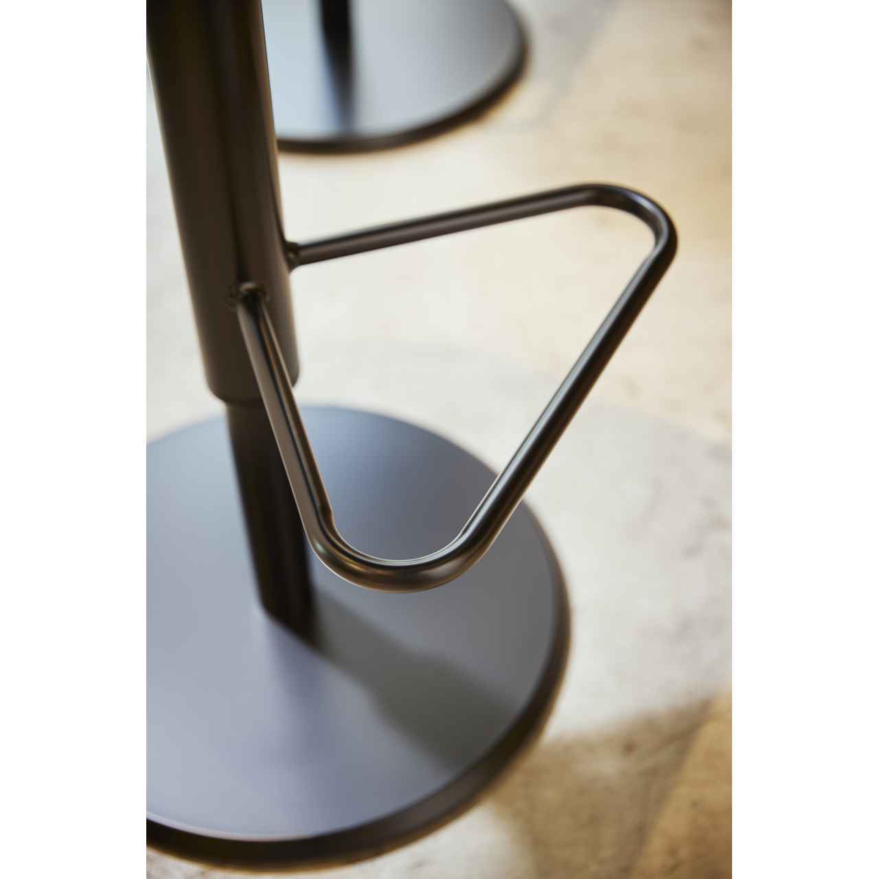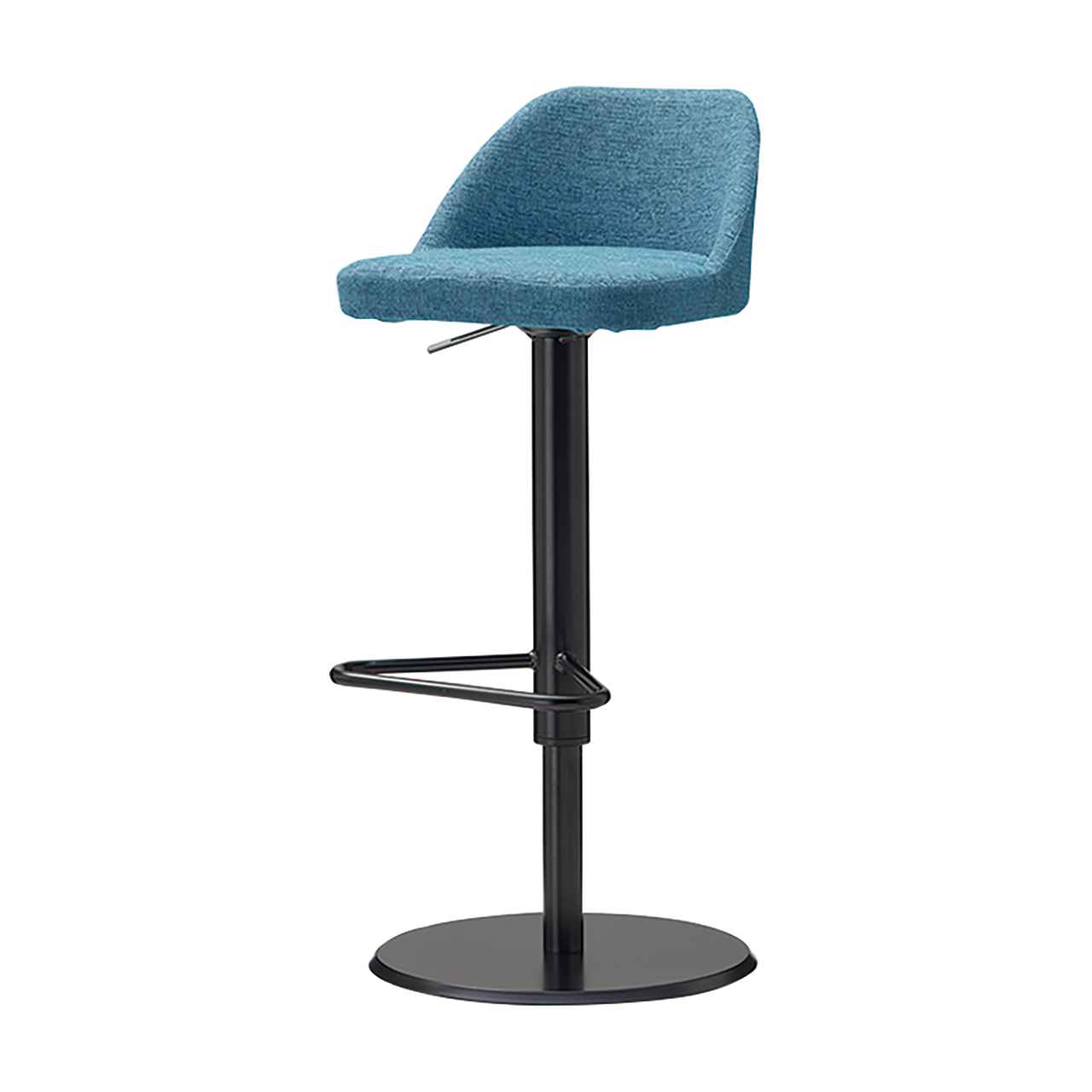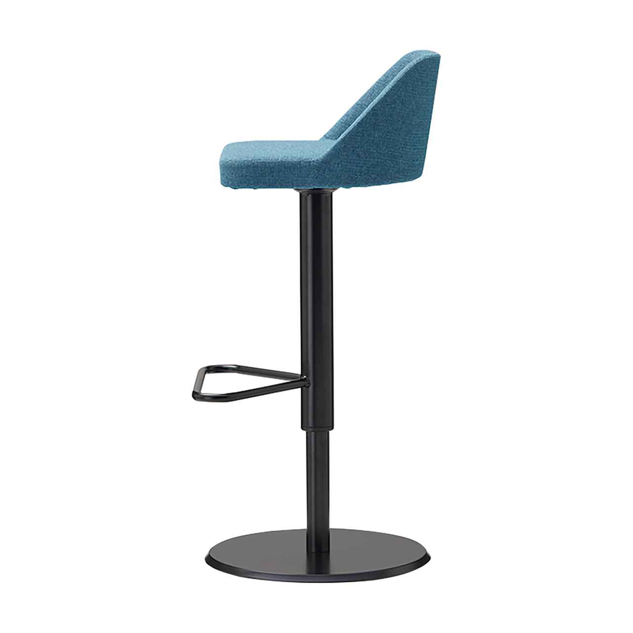ローバックのコンパクトな座面に回転昇降機能を備えたハイチェアです。カウンターの高さや使用者に合わせて自在に調整可能で、快適な座り心地を提供します。オリジナル形状の丸みを帯びた三角形フットレストが座面上部のやわらかな曲線と統一感を生み、カフェやオフィスのカウンターエリアなどで上品で洗練された空間を演出します。