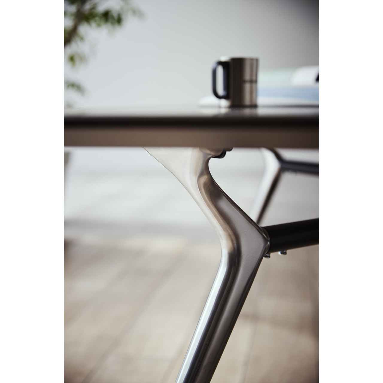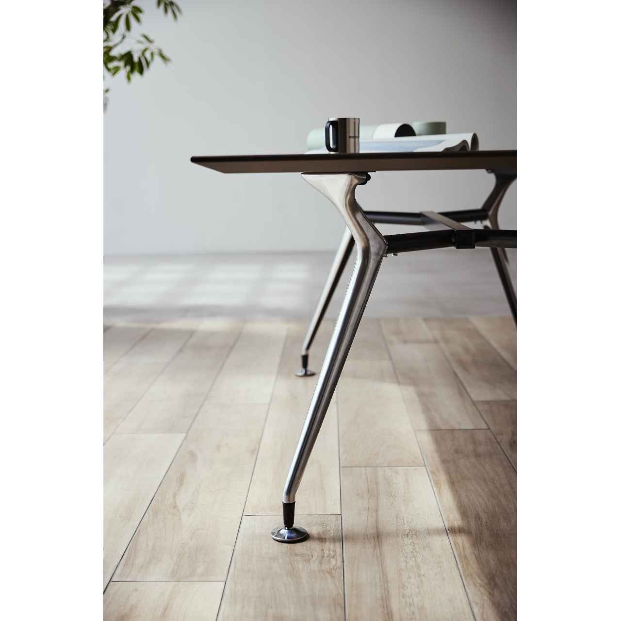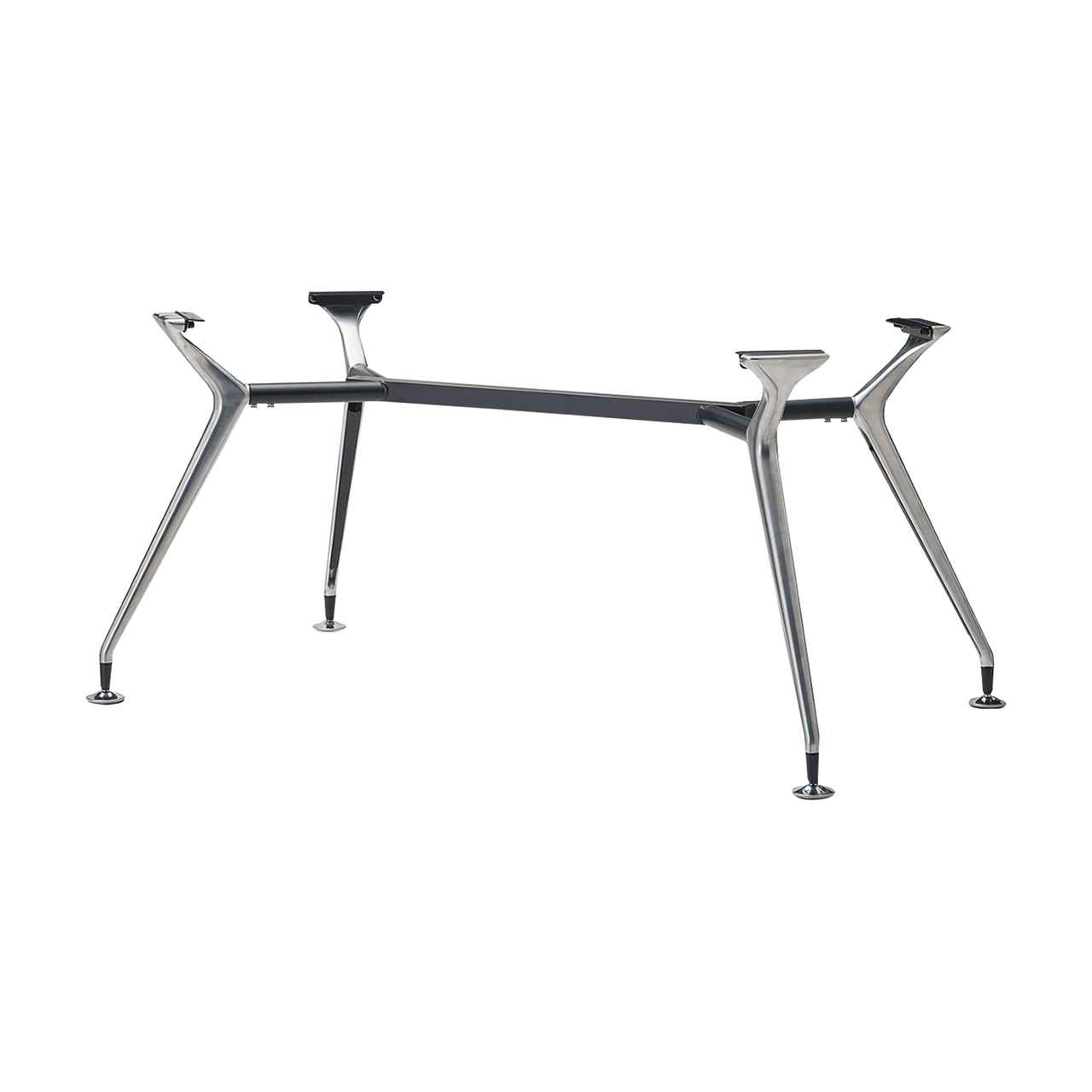 テーパー形状でスタイリッシュな脚が、モダンテイストの空間に調和するテーブル脚です。アルミダイカスト製で磨き仕上げのポリッシュと汎用性の高いブラックの2色展開となっており、W4000×D1400サイズの天板まで対応可能です。オフィスのミーティングルームやコワーキングエリアなど、キャスターチェアやスチールチェアと組み合わせてモダンで洗練された空間を演出します。