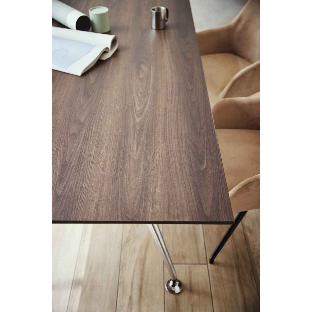 テーブルに求められる美しさと機能性を兼ね備えた、指紋レス仕様のメラミン化粧板(セルサス)を採用した天板です。光を抑えたマットな質感がしっとりとした触感と深みのある表情を生み、空間に上質で落ち着いた印象を与えます。指紋や皮脂汚れが目立ちにくく、清潔感とメンテナンス性を両立。カフェやレストラン、商業施設やオフィスなど幅広い空間に適した天板で、Aタイプは舟底仕様、Bタイプはメラミン共巻仕様となっています。
