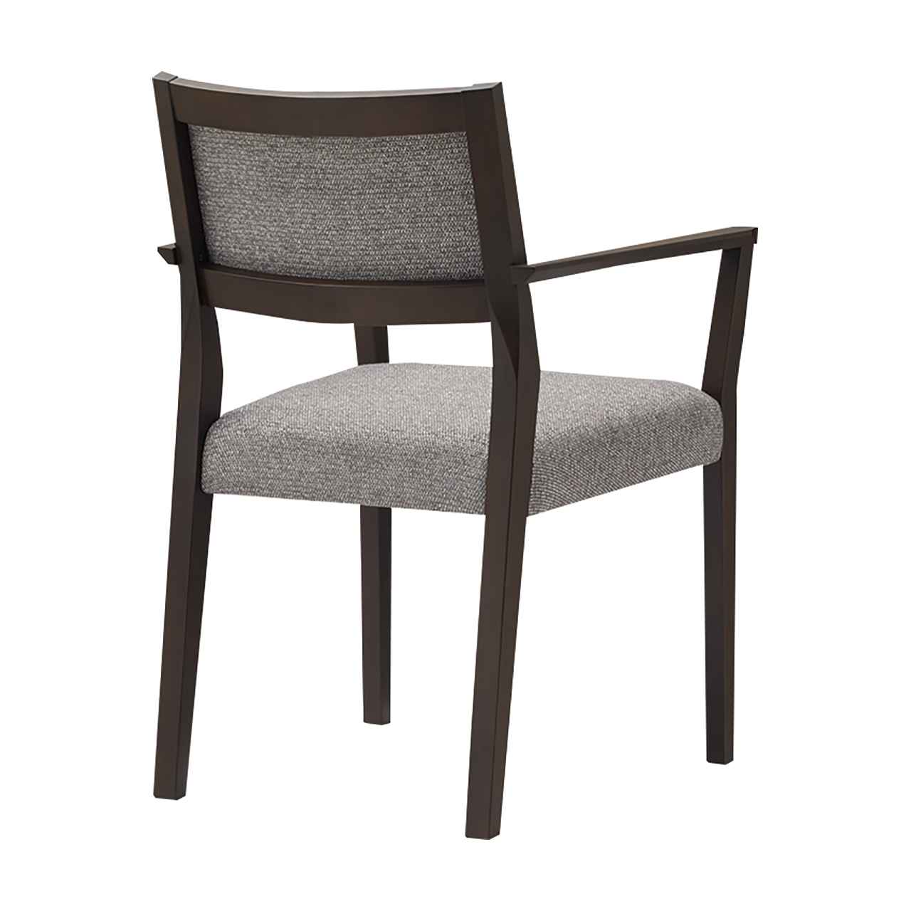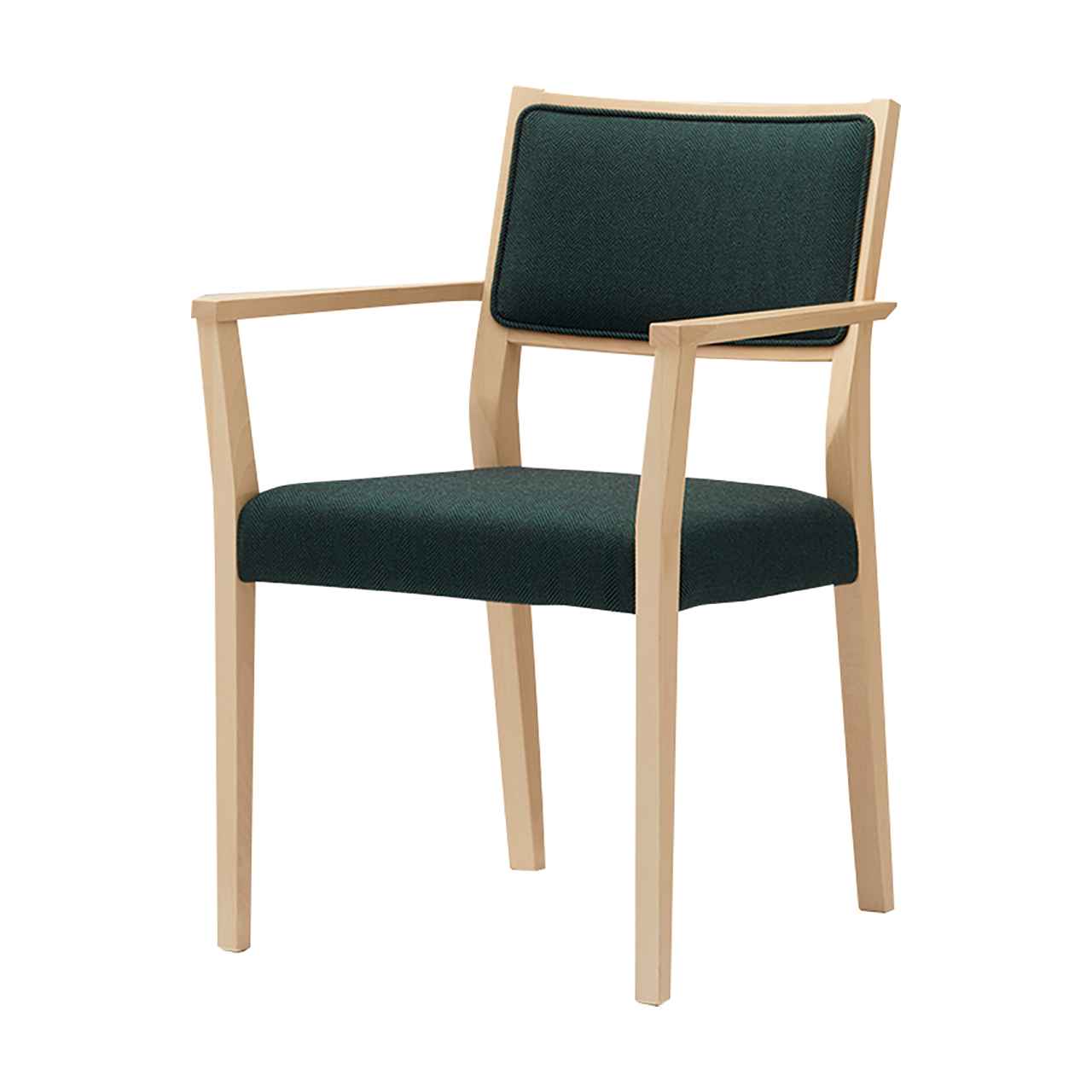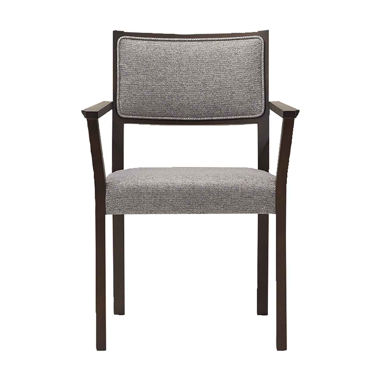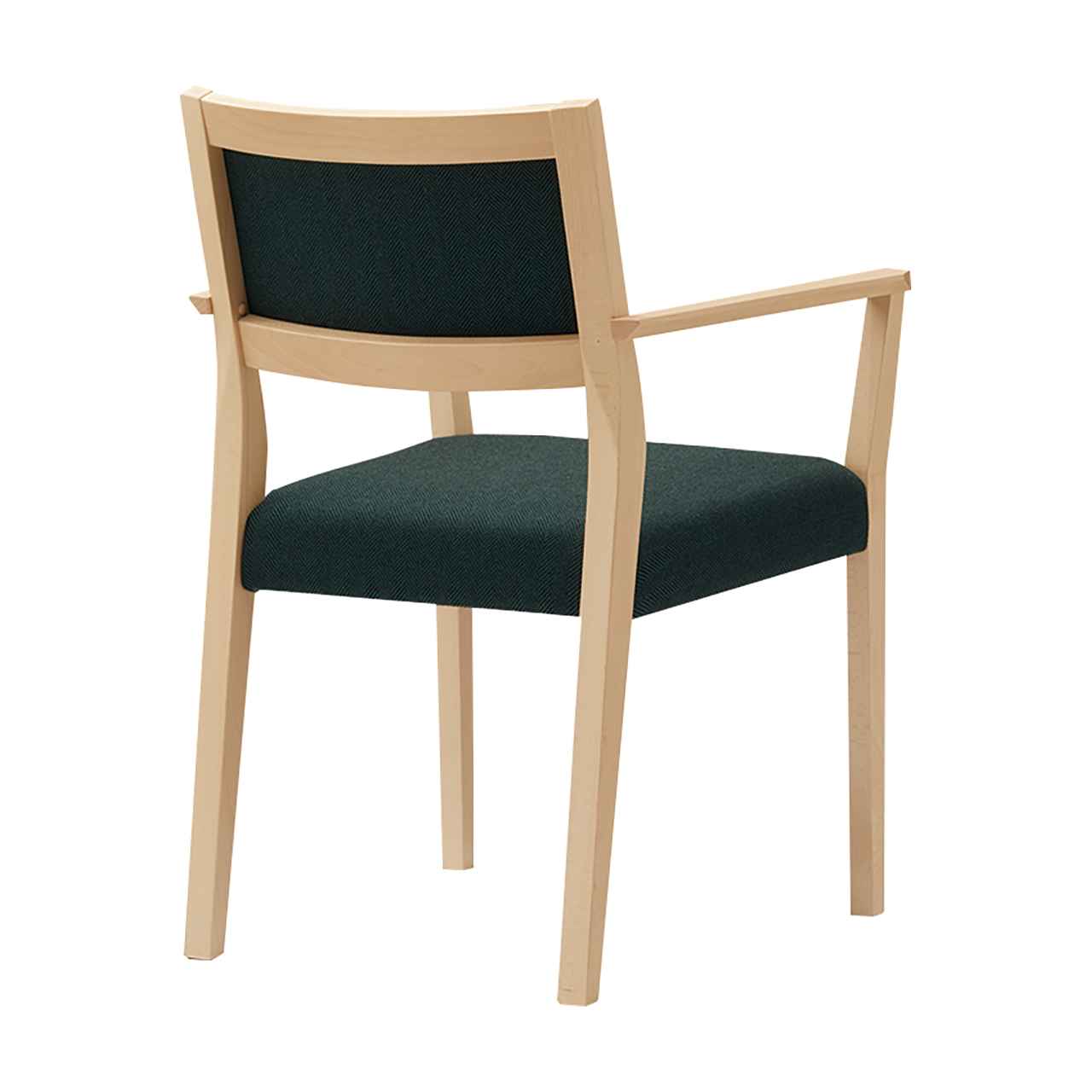 シンプルモダンなデザインで、カフェやレストラン、オフィス、待合スペースなど様々なシーンにマッチする汎用性の高いチェアシリーズです。フレーム背面上部には手じゃくり加工が施され、出し引きがしやすい機能性を備えています。アームの先端部分は角落とした形状にすることで使う人にも優しいデザインに仕上がりました。