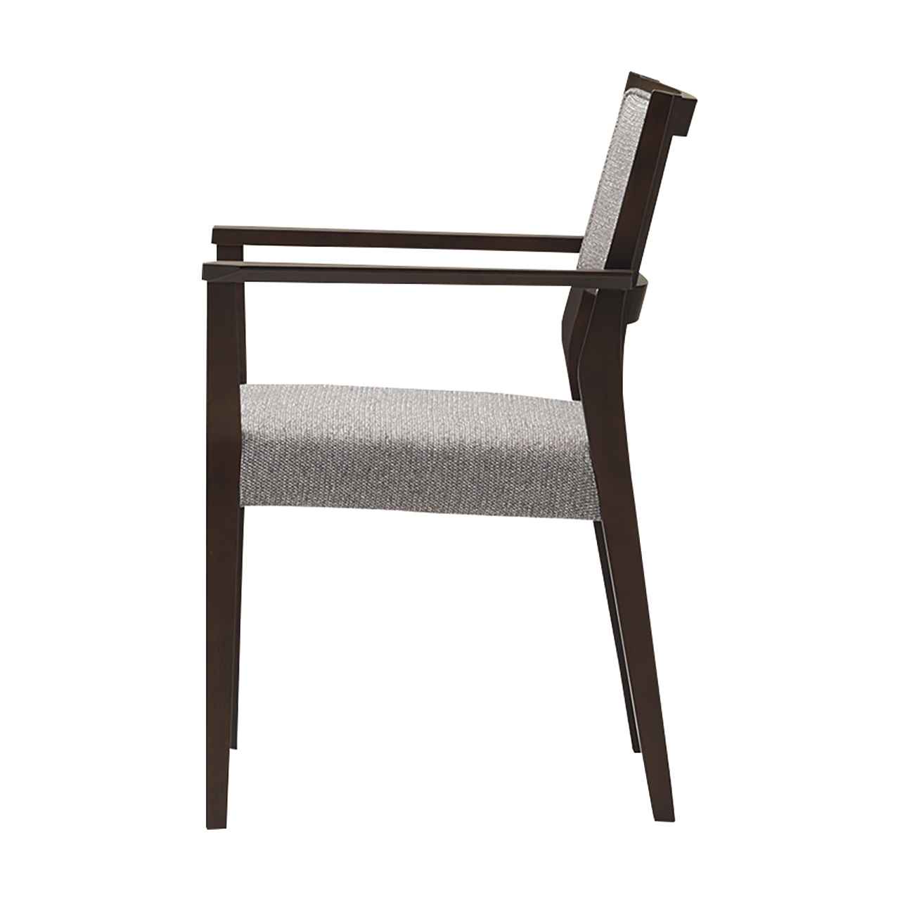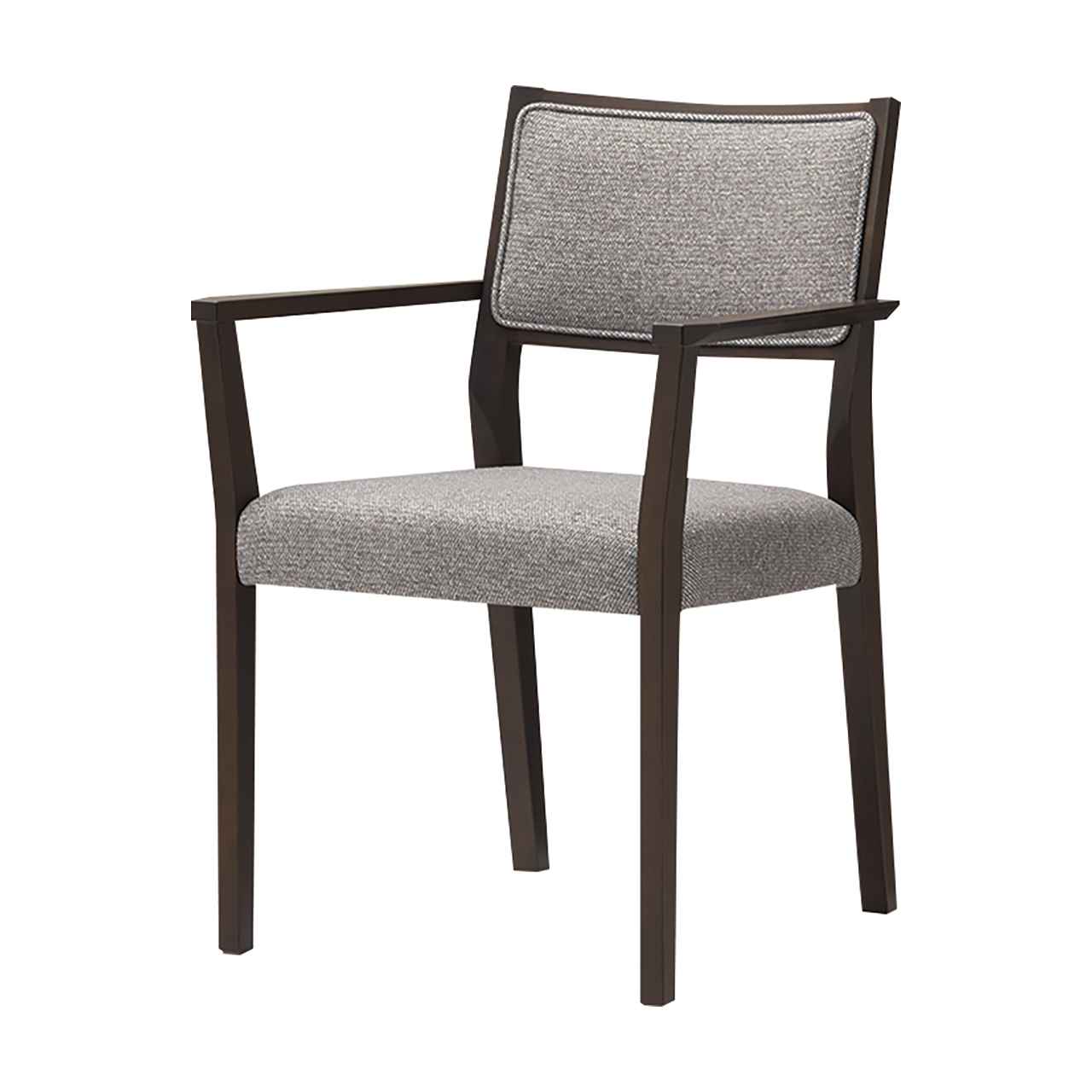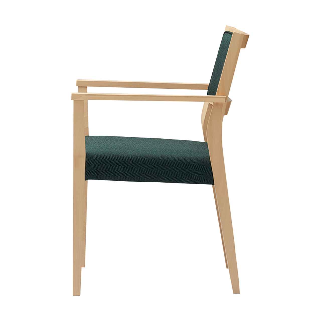 シンプルモダンなデザインで、カフェやレストラン、オフィス、待合スペースなど様々なシーンにマッチする汎用性の高いチェアシリーズです。フレーム背面上部には手じゃくり加工が施され、出し引きがしやすい機能性を備えています。アームの先端部分は角落とした形状にすることで使う人にも優しいデザインに仕上がりました。