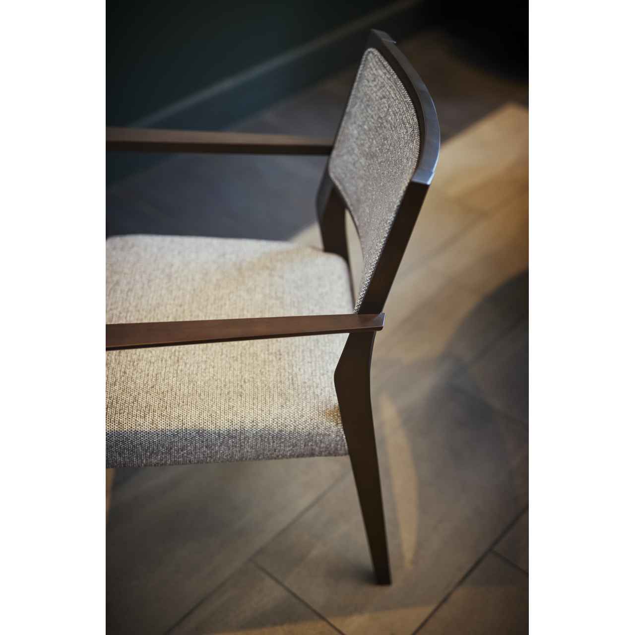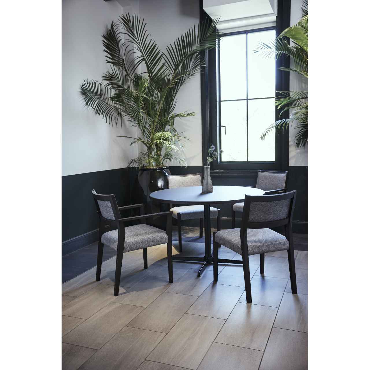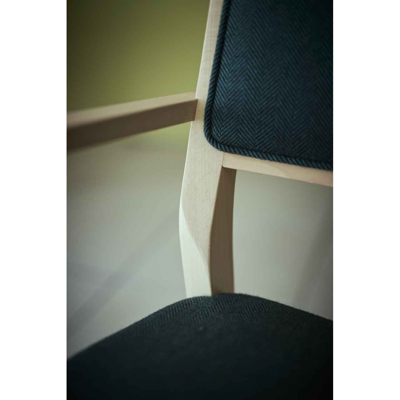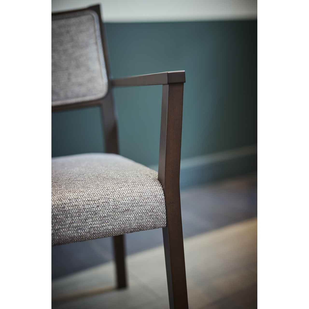 シンプルモダンなデザインで、カフェやレストラン、オフィス、待合スペースなど様々なシーンにマッチする汎用性の高いチェアシリーズです。フレーム背面上部には手じゃくり加工が施され、出し引きがしやすい機能性を備えています。アームの先端部分は角落とした形状にすることで使う人にも優しいデザインに仕上がりました。