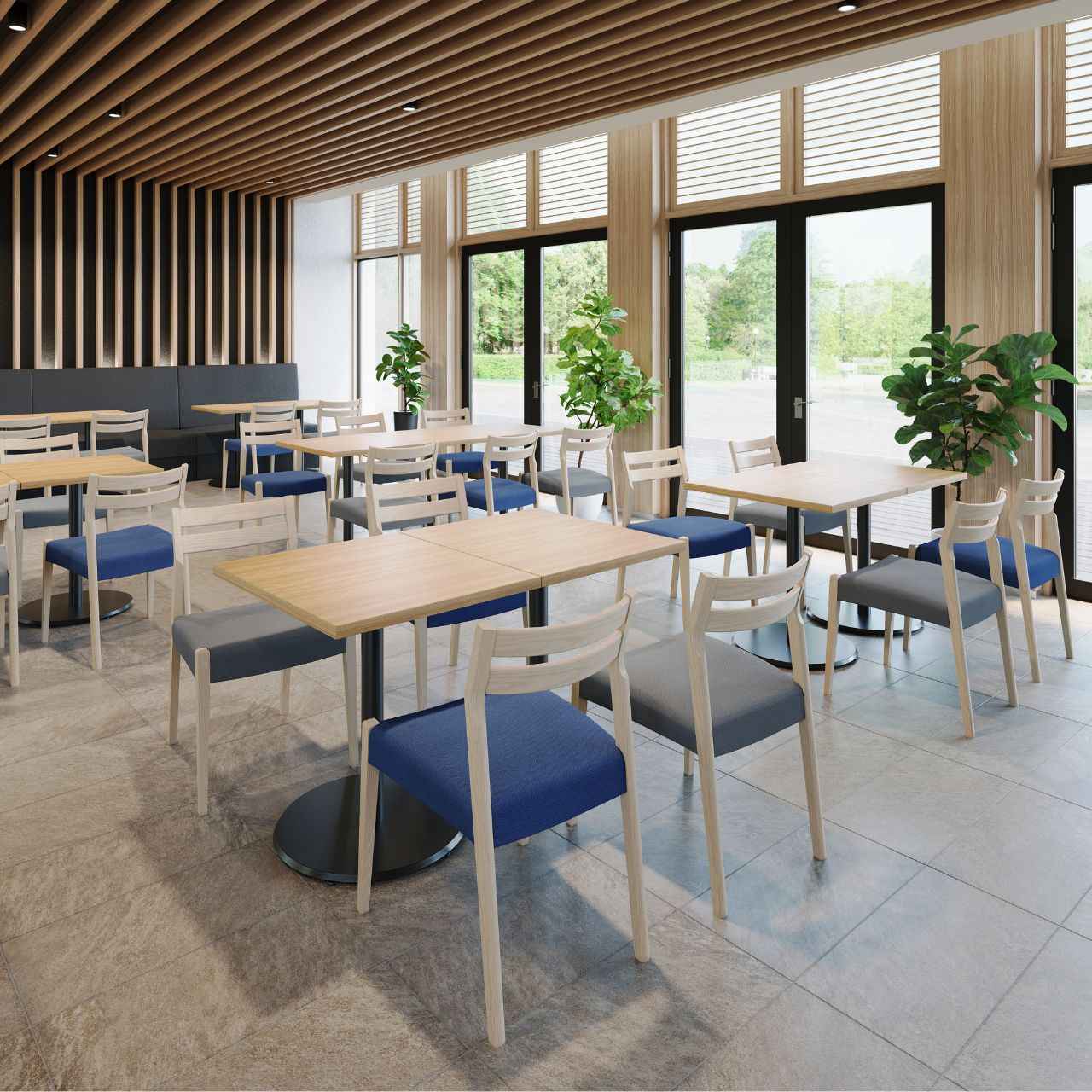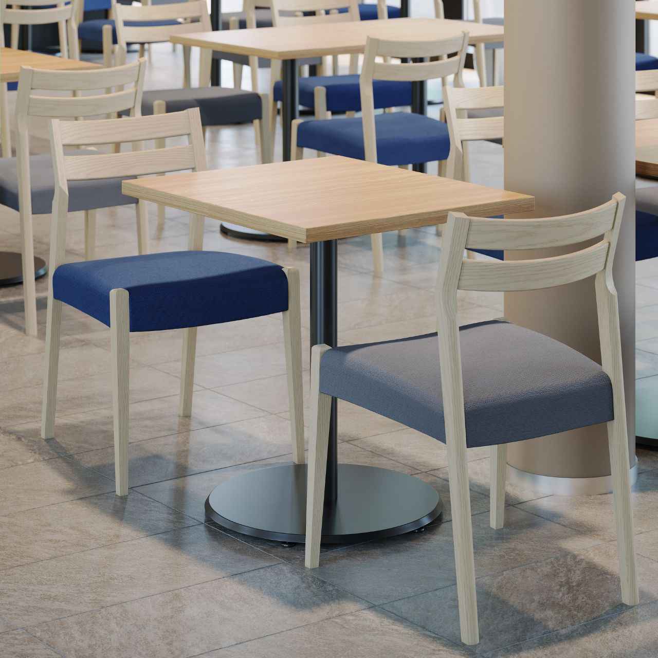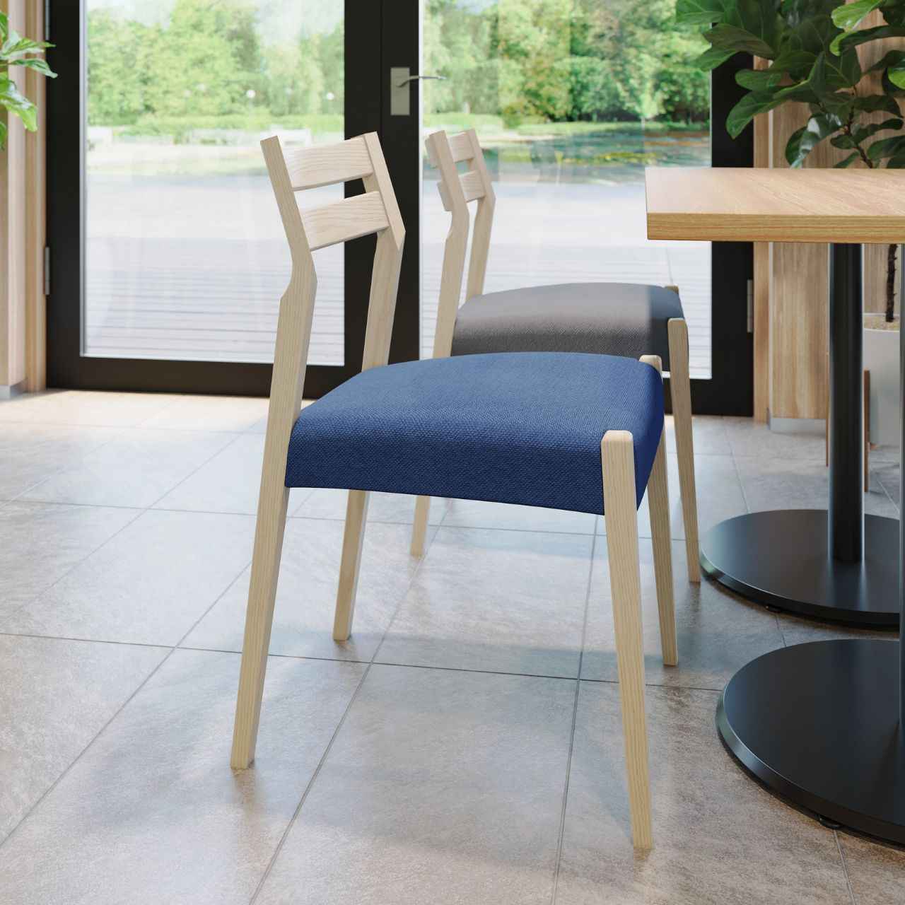 柔らかな木目を活かしたフレームに、程よい厚みの座面を組み合わせたシンプルで洗練されたデザインの木製椅子です。背中を優しく支える2本の背板とテーパー加工された脚部が、空間に軽快さと品の良さを添えます。カフェやレストラン、商業施設のフードコートなどに木のぬくもりを与えてくれる汎用性の高いデザインで3.9kgと軽量なのもポイントです。