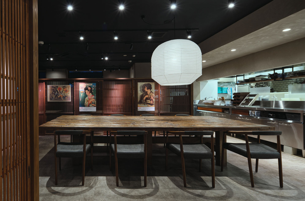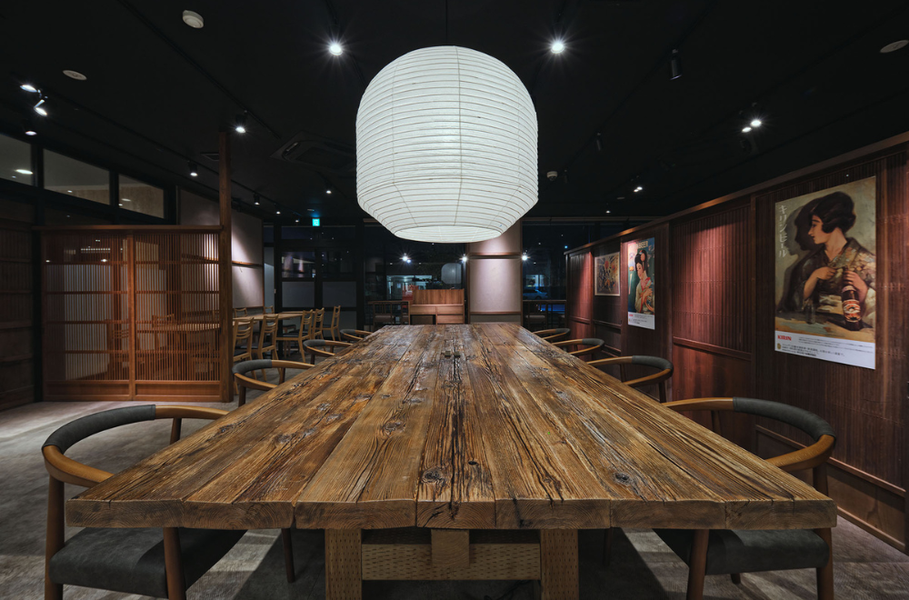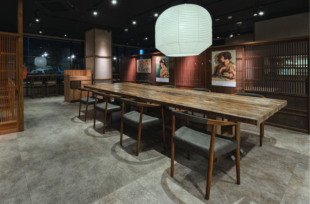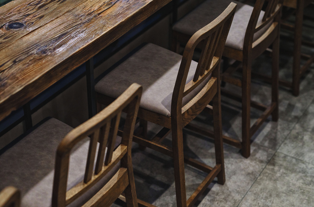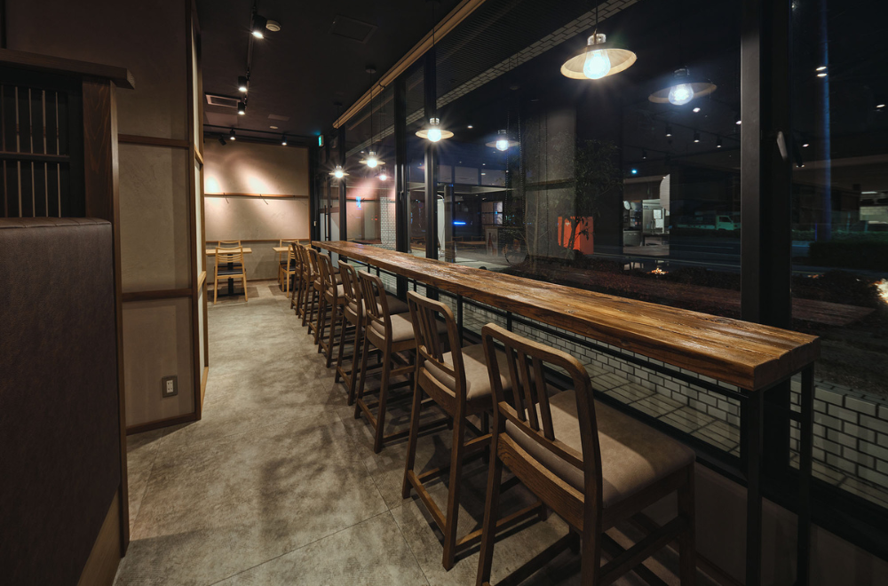 草津第一ホテル内にあるレストラン「つたいキッチン」にABORD W012 アームチェア、Coccole C206S カウンターチェアを採用いただきました。中央にはラフな木目を活かした大判テーブルを据え、その周囲にW012 アームチェアを均等に配置することで、視線と動線が自然と集まる構成としています。低めに抑えた背とゆとりのあるアームが、テーブルのボリュームに対して圧迫感を抑えつつ、滞在性を支えます。窓際にはC206S カウンターチェアを連続して配置し、外へ抜ける視線と並行するカウンター席を形成。中央は複数人での共有、周縁は一人利用と、家具配置によって機能を明確に切り分けています。無垢材の天板と木フレーム、ファブリック座面の組み合わせが、ダークトーンの内装に柔らかなコントラストを与え、空間全体に温もりをもたらしています。